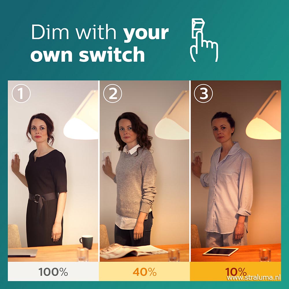 Bepaal zelf je eigen sfeer met de Philips SceneSwitch gewoon met je bestaande lichtschakelaar en deze lichtbron. Je hebt meerdere lichtinstellingen zonder dimmer of lastige installatie. Druk je schakelaar aan en uit en je krijgt een andere sfeer. Bovendien heeft de lamp een automatisch geheugen dankzij een ingebouwde geheugenchip, waardoor de lamp je laatste instelling onthoudt als de lichtschakelaar langer dan 6 seconden wordt uitgeschakeld.