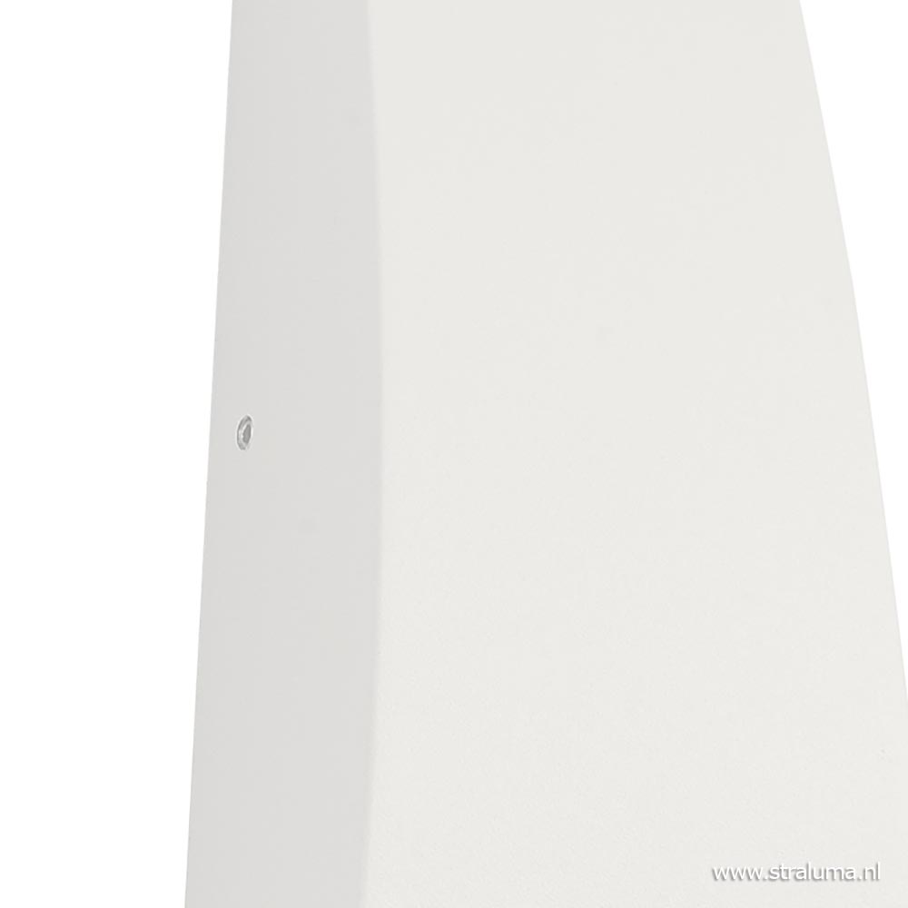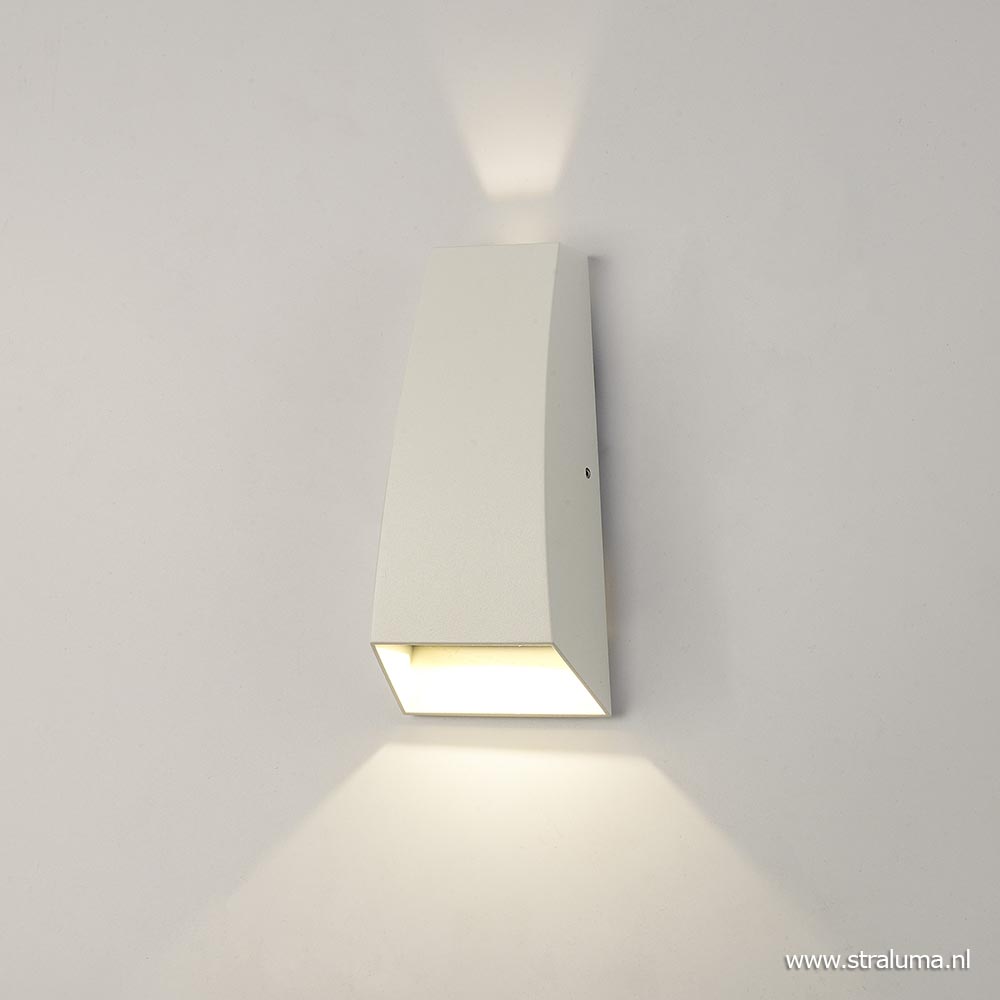 Deze kleine wandlamp is overdags vrijwel onzichtbaar, maar des te beter zichtbaar in de avond. De kleine wandlamp is volledig van aluminium en uitgevoerd in wit. Wat de lamp zo leuk maakt is dat deze zowel een up- als een downlighter is. Aan beide zijde zit geïntegreerd LED waardoor er een sfeervol zandloper effect ontstaat op de ondergrond. Door het taps toelopen van de buiten wandlamp, is aan de bovenzijde de lichtverspreiding smaller dan onder. Het LED wordt beschermd door glas zodat de wandlamp goed is afgesloten. De lamp is dan ook IP54 goedgekeurd en weerbestendig van -10° tot +45°C. Door het kleine formaat past deze buitenlamp gemakkelijk op een schuur, schutting of muur naast de voordeur.