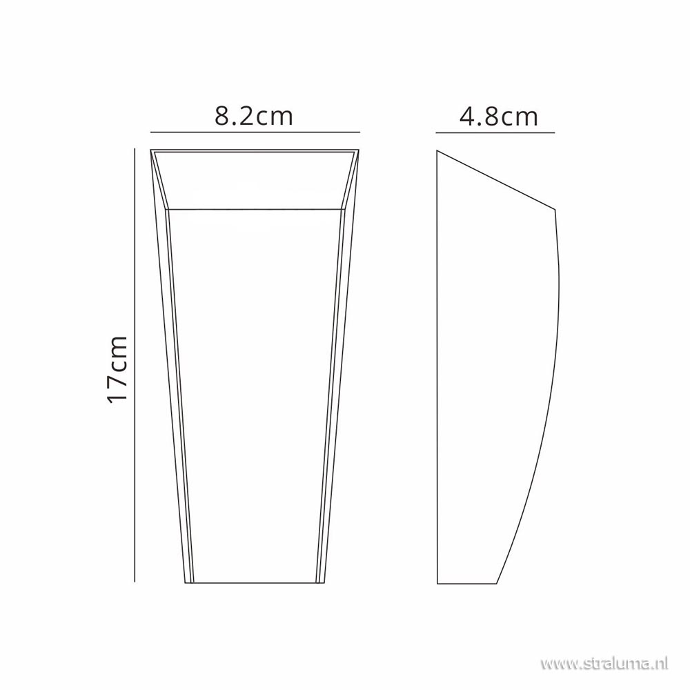 – totale afmeting: 8,2×4,8×17 cm – aluminium, antraciet – IP54 goedgekeurd – inclusief LED – 3000 Kelvin – 420 lumen – gewicht: 0,32 kg – weerbestendig van -10° tot +45°C – levensduur: 20.000 branduren