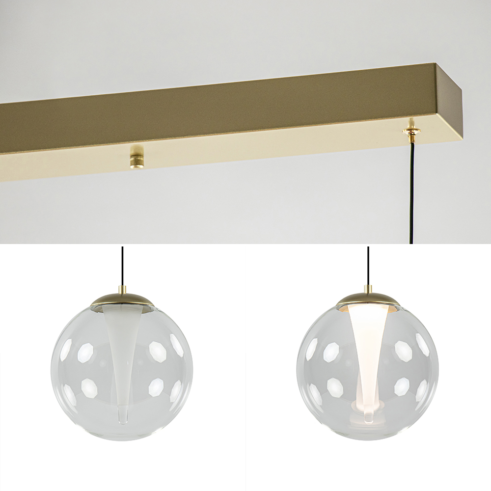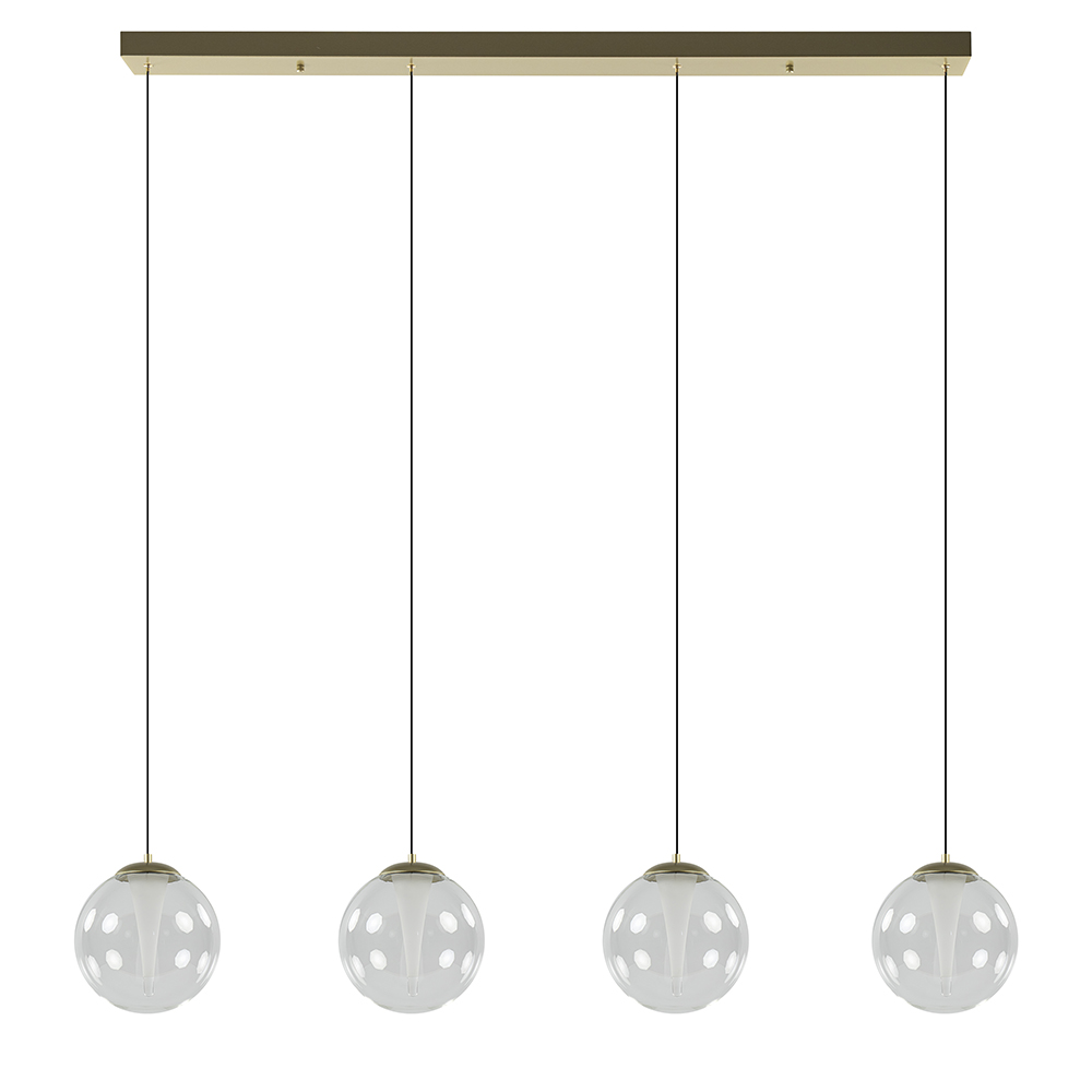 Deze stijlvolle hanglamp maakt de eetkamer helemaal af. De 4-lichts hanglamp heeft een gouden armatuur dat is gecombineerd met helder glas. In de helder glazen bollen is ook nog een mat binnenglas toegepast welke oplicht wanneer de lamp wordt ingeschakeld. Dit geeft een mooi en chic effect dat de lamp helemaal eigen maakt. De glazen bollen hangen aan zwarte snoeren die naar wens zijn in te korten. De maximale hoogte van de eetkamerhanglamp is 150 cm. De gouden hanglamp is voorzien van geïntegreerd LED en is dimbaar middels een externe dimmer (exclusief).
