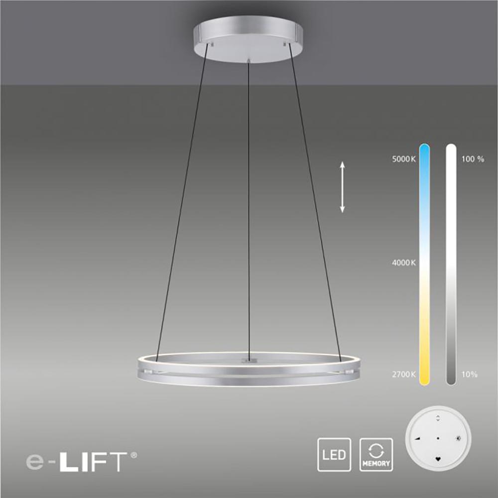 – hoogte: 40-350 cm – kap: Ø70,1×6 cm – bevestiging: Ø35×6 cm – aluminium – inclusief LED – 1950 lumen – 2700 – 5000 Kelvin – E-Lift functie – dimbaar – memory – inclusief remote – gewicht: 8,5 kg