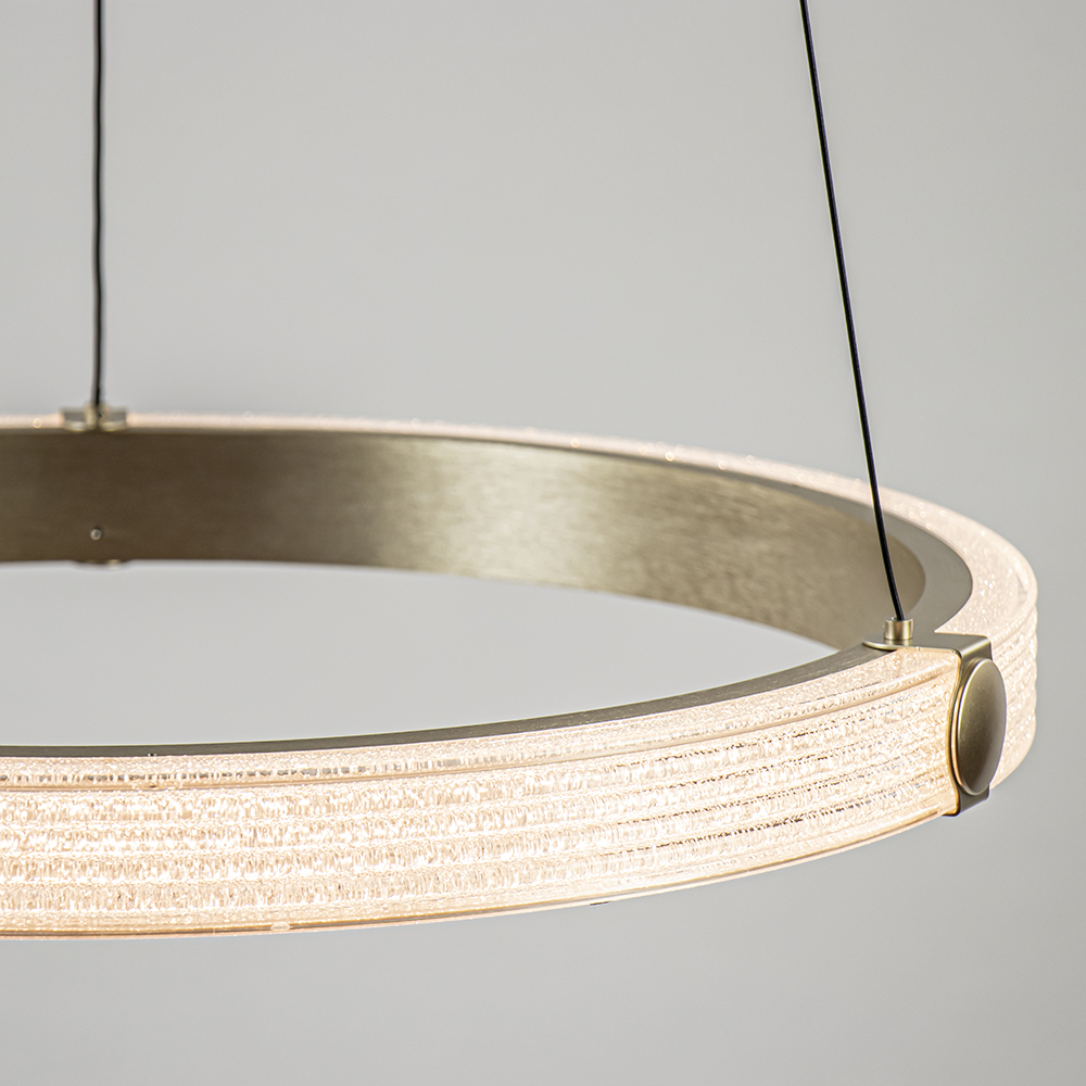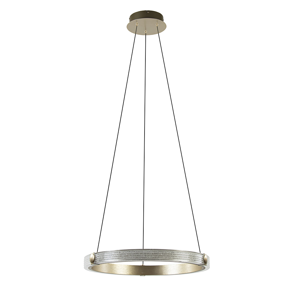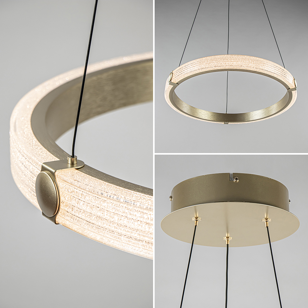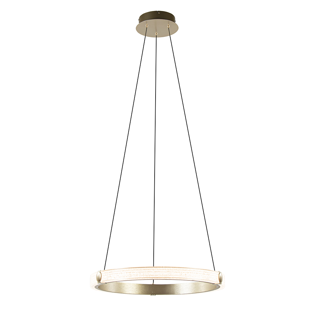 Deze prachtige hanglamp heeft een elegante en luxe uitstraling. De ring is uitgevoerd in het geborsteld goud met een kunststof rand met kristaleffect. Dit geeft een extra luxe uitstraling aan de lamp. De gouden ring hangt aan drie smalle snoeren die naar wens zijn in te korten. De moderne hanglamp is dimbaar middels een externe dimmer (exclusief). Ideaal voor boven een ronde eettafel, kookeiland of zelfs in de slaapkamer.