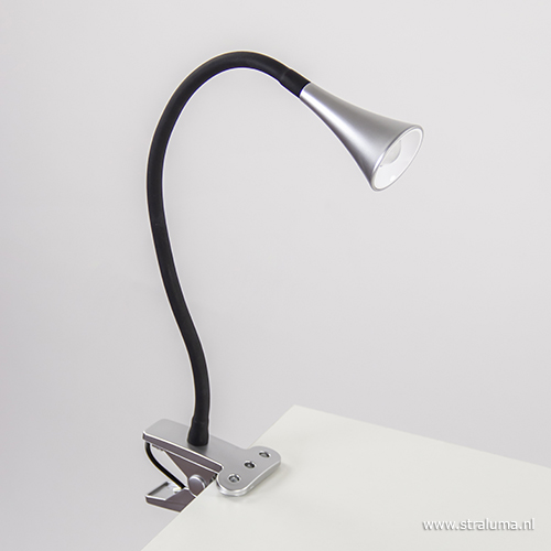 Deze moderne klemlamp is ideaal voor het bijschijnen van wat extra licht. De flexibele arm kan alle kanten op buigen zodat de verlichting altijd de gewenste kant op schijnt. Ideaal is ook dat de klem 3 cm open kan en daardoor op vele tafels, bureau’s of het randje van uw bed past. Dit functionele lampje kan gemakkelijk dienen als bureau of leeslamp en is voorzien van LED verlichting, energiezuinig dus. De klemspot is voorzien van een zwart snoer met schakelaar en verkrijgbaar in 3 kleuren, wit, zwart en zwart/zilver.