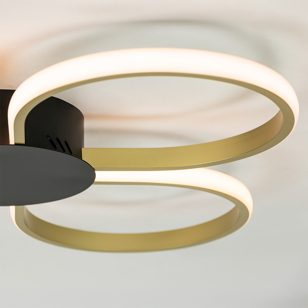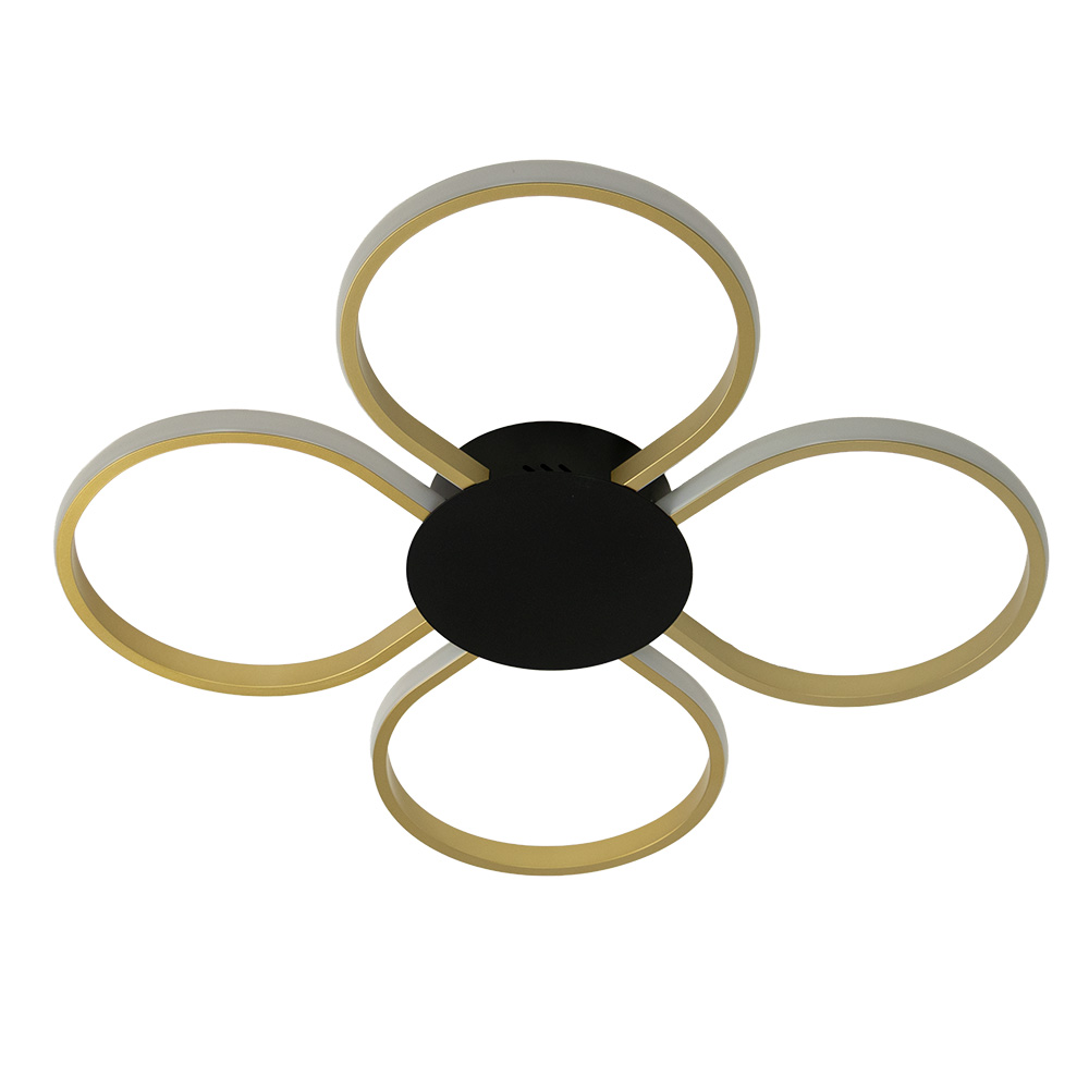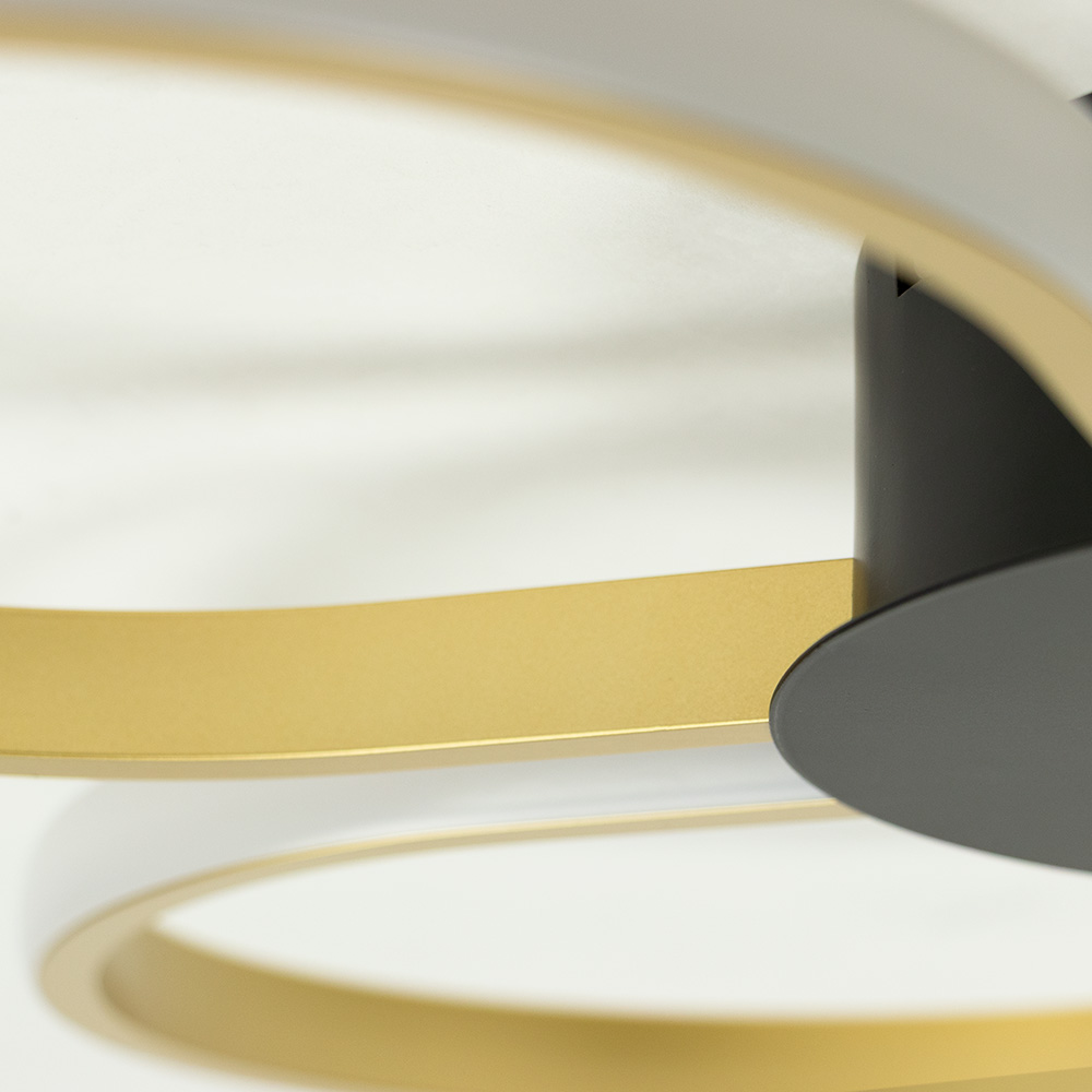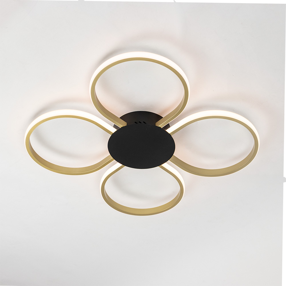 Stijlvolle plafondlamp Circo is een absolute blikvanger in elk modern interieur. Met haar vier elegante LED-ringen die als bloembladen zijn gevormd, combineert deze lamp functionaliteit met een speelse, futuristische uitstraling. De goudkleurige accenten en het zwarte middendeel zorgen voor een luxueuze en eigentijdse look. De geïntegreerde LED-verlichting straalt een aangenaam warm wit licht uit en zorgt voor een gelijkmatige verlichting van de ruimte. Ideaal voor gebruik in onderandere de woonkamer, slaapkamer of hal. Dankzij het compacte ontwerp is de lamp perfect voor plafonds met een lagere hoogte.
