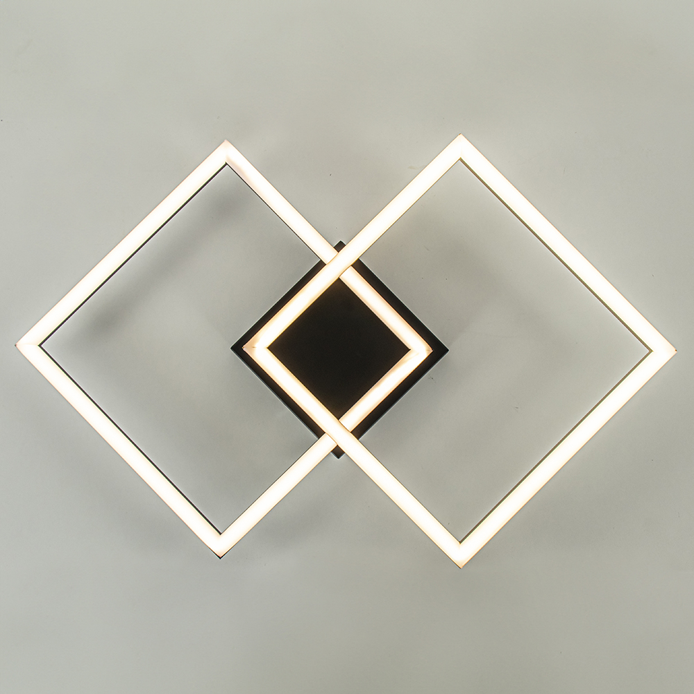 Perfect voor een woon- of slaapkamer. Plafondlamp double square is groot van design en strak van vormgeving. De plafondlamp heeft een metalen armatuur dat is uitgevoerd in het zwart met goud. Beide vierkantjes zijn voorzien van geïntegreerd LED en doordat deze onder de bevestiging hangen lijkt het alsof ze loskomen van het plafond. De moderne plafondlamp is dimbaar middels een externe dimmer (exclusief).