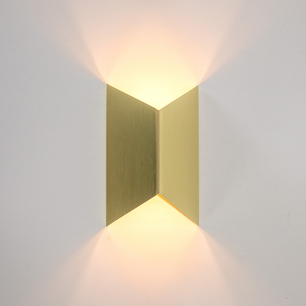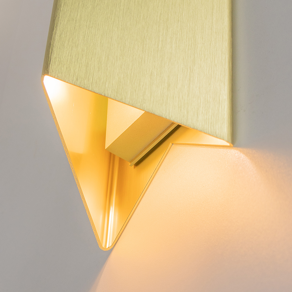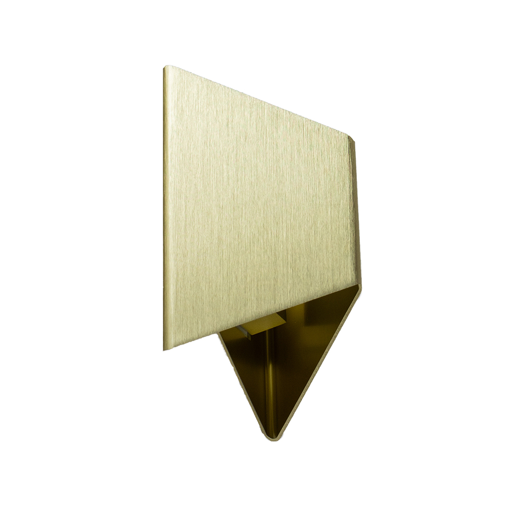 Een stijlvol strak wandlampje perfect voor in de hal of naast het bed. De lamp heeft de vorm van een prisma en is gemaakt van goud kleurig metaal. Door de gleufjes aan de boven en onder zijde is er een speels, maar strak effect gecreëerd wat perfect past in een moderne woonstijl.