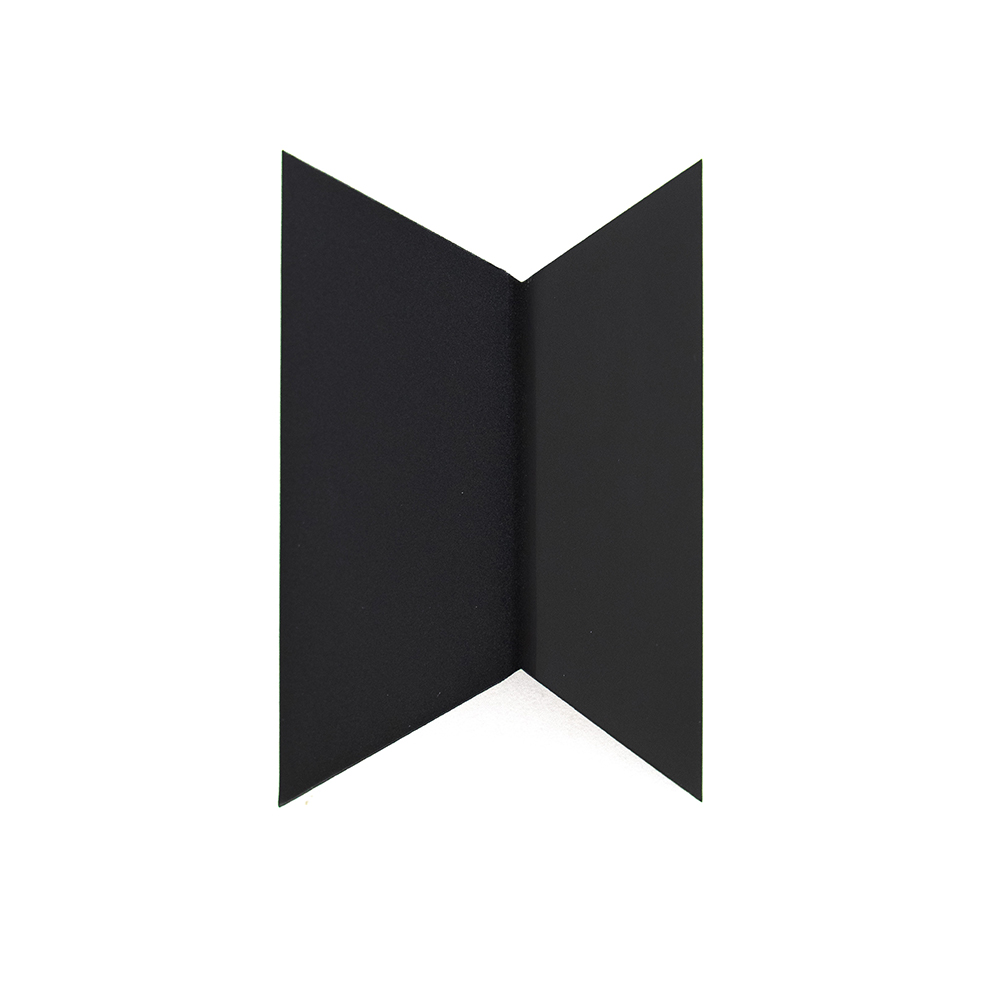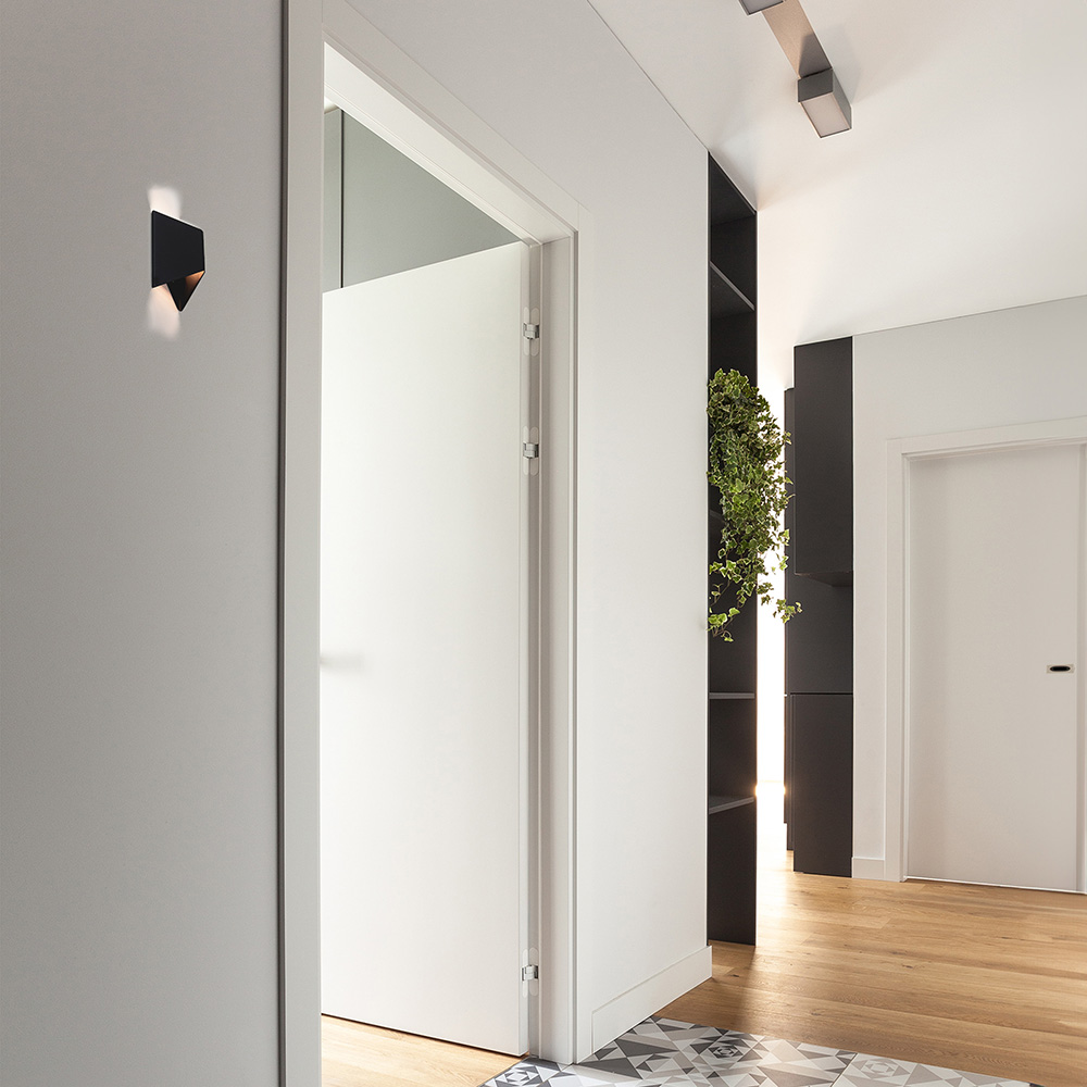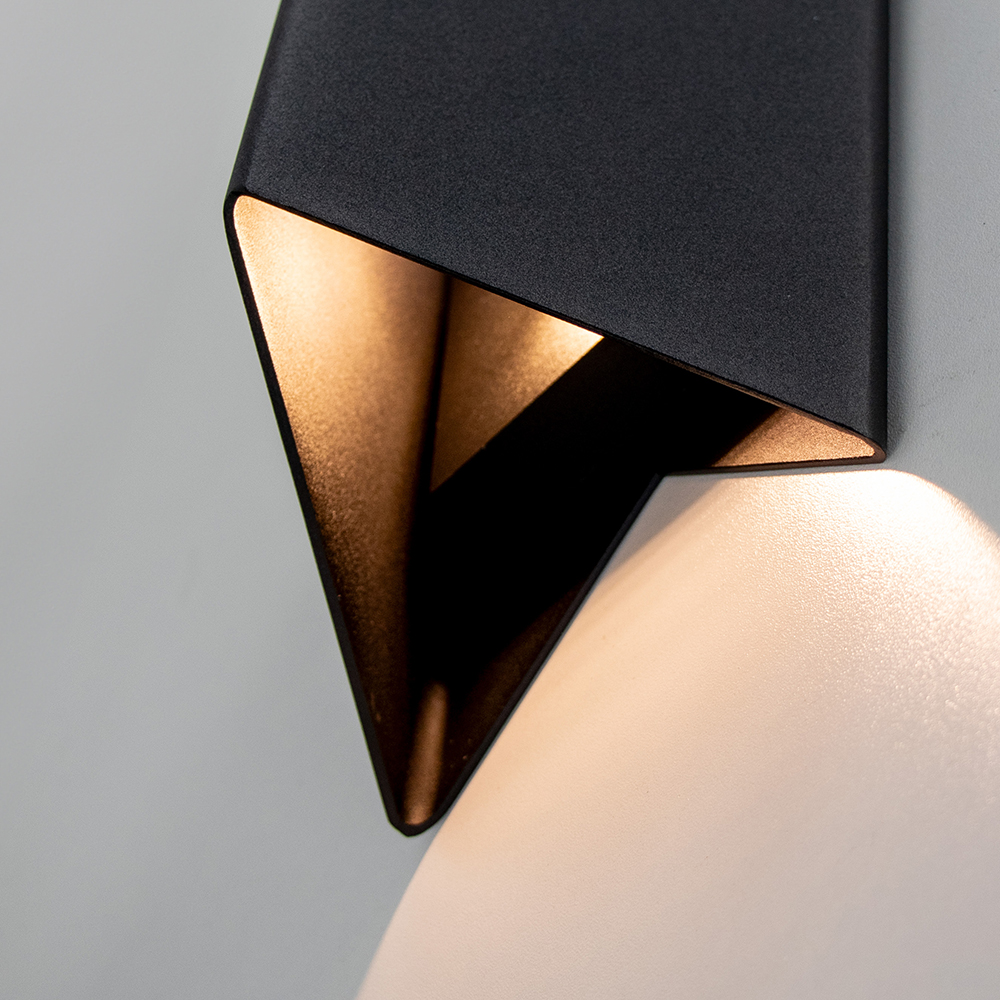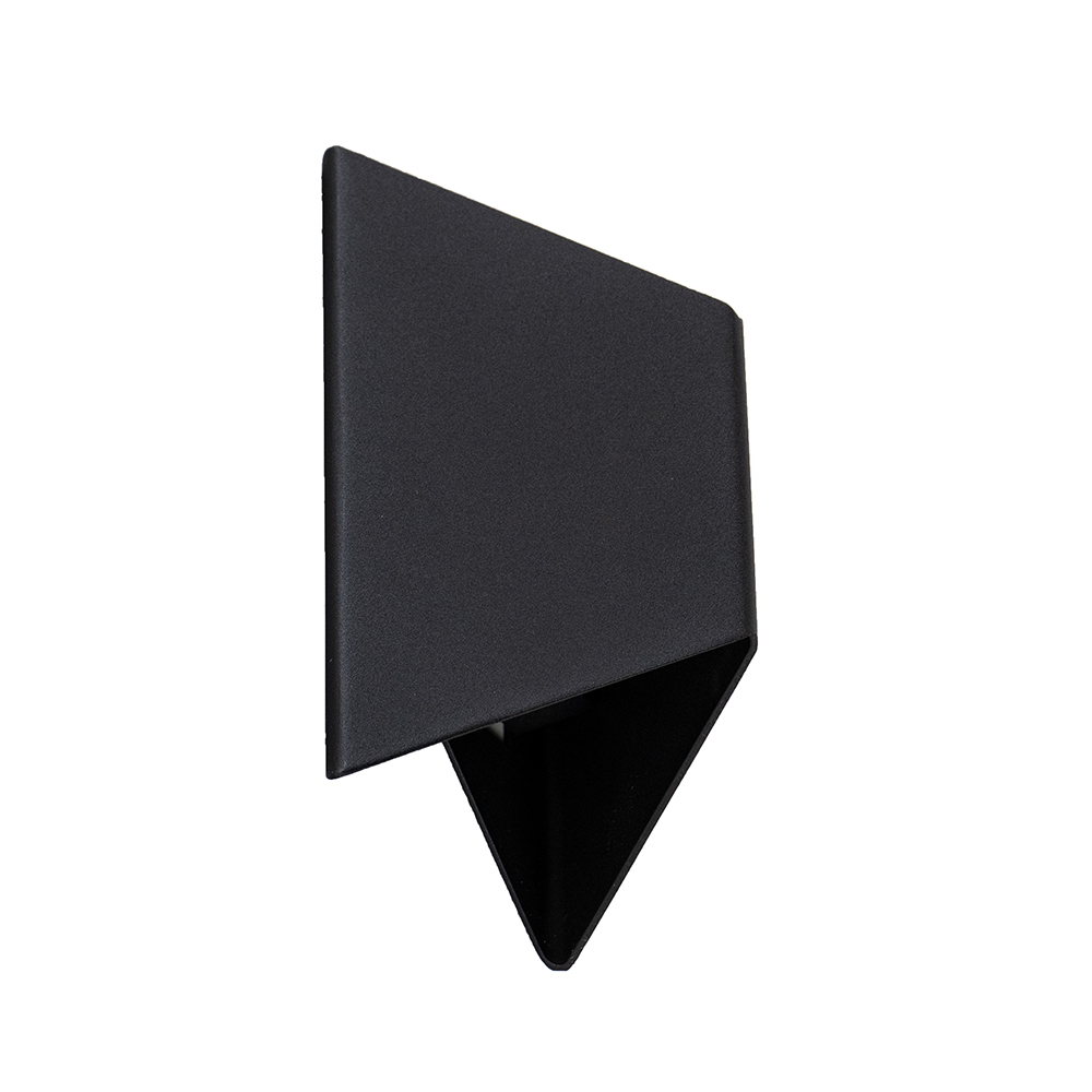 Een stijlvol strak wandlampje perfect voor in de hal of naast het bed. De lamp heeft de vorm van een prisma en is gemaakt van mat zwart metaal. Door de gleufjes aan de boven en onder zijde is er een speels, maar strak effect gecreëerd wat perfect past in een moderne woonstijl.