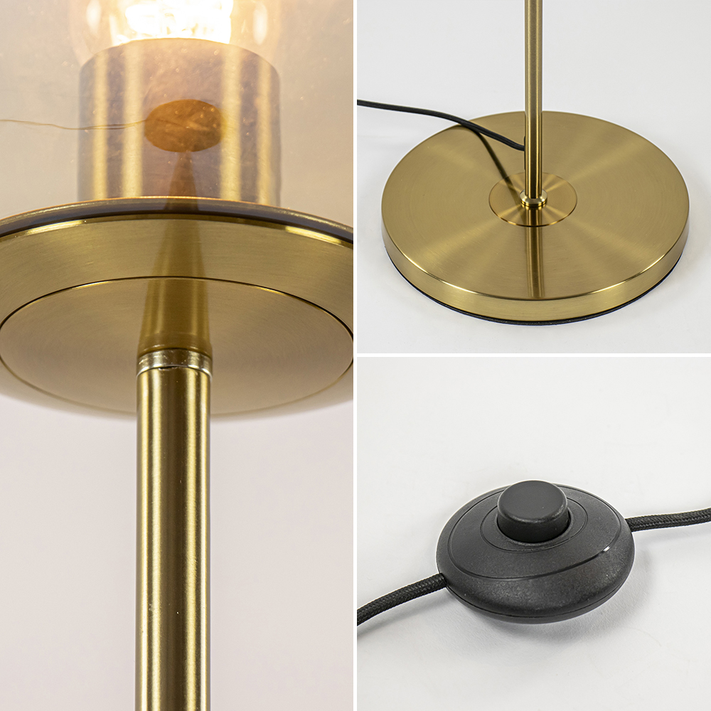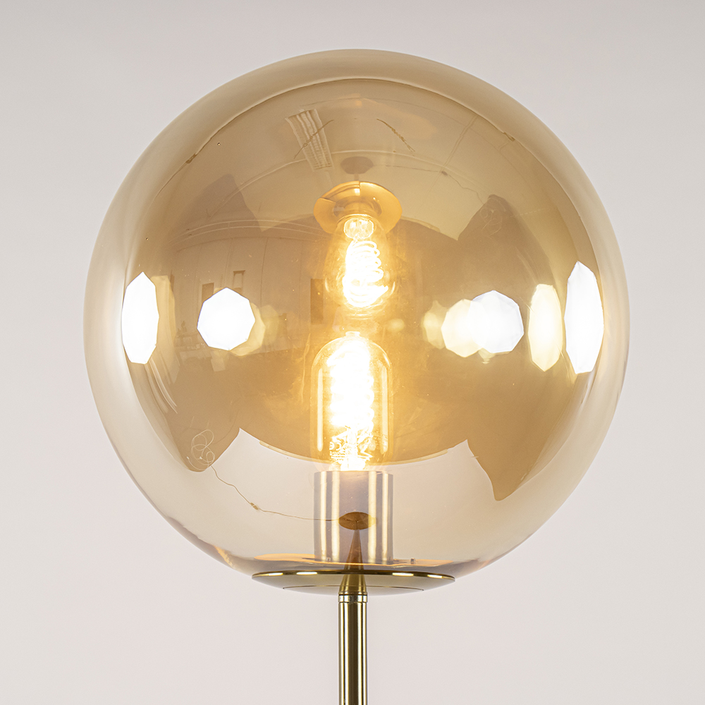 – afm: Ø30×160 cm – kap: Ø30 cm – voet: Ø28×3 cm – metaal – goud – amber glas – exclusief lichtbron (E27) – zwart snoer: 260 cm