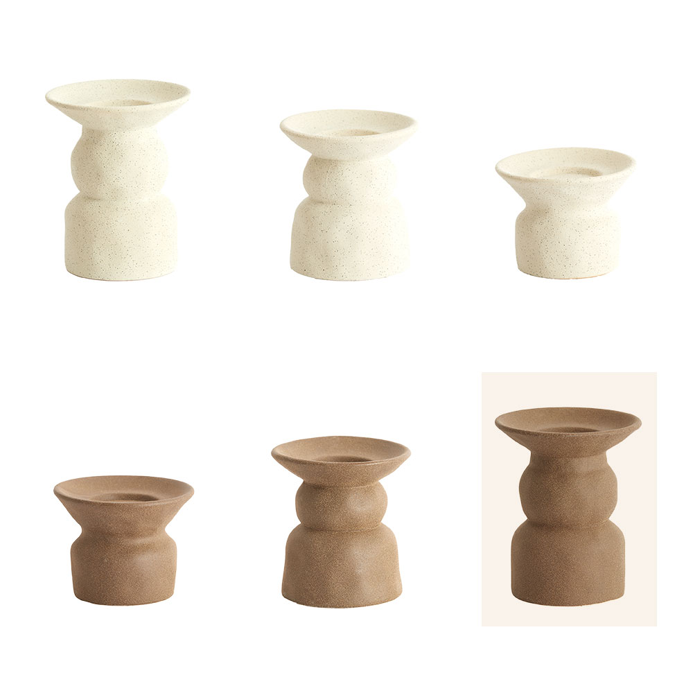 De matte tinten in warm bruin en zacht crème benadrukken het ambachtelijke karakter van het ontwerp. De serie bestaat uit drie formaten per kleur, waardoor je ze prachtig kunt combineren voor een speels en harmonieus geheel.
