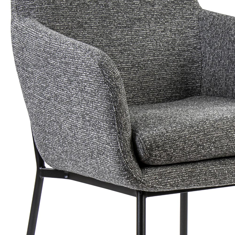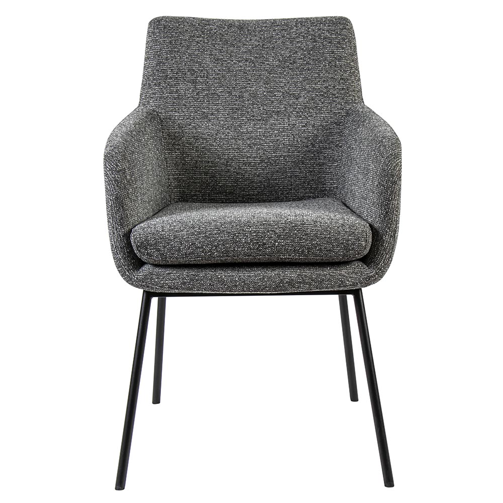 Een prachtige eetkamerstoel in een gemeleerde stof. De armstoel heeft een comfortabele zitting en de armleuningen bieden extra ondersteuning tijdens het dineren en natafelen. De stoffen zitting heeft een metalen onderstel die is voorzien van een zwarte finish. Dit geeft de stoel een moderne look. De slanke pootjes houden het geheel lichtig en open.