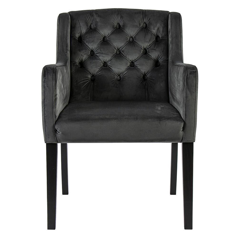 Deze prachtige eetkamerstoel is een verrijking voor het interieur. De luxe stoel heeft een comfotabele zitting die is uitgevoerd in het velvet mid grey. De rugleuning is aan de binnenzijde gecapitonneerd wat de luxe chique uitstraling extra benadrukt. De stoel heeft eiken houten poten die zijn uitgevoerd in het mat zwart. Alles bij elkaar maakt de stoel prima geschikt voor een hotel chic, luxury of strak klassiek interieur. Dineren wordt in ieder geval en groot plezier in deze fijne armstoel.