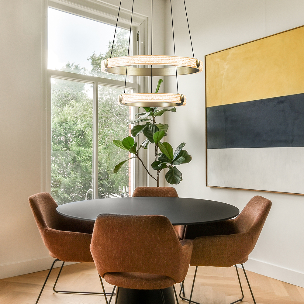 Deze prachtige hanglamp heeft een elegante en luxe uitstraling. De lamp is samengesteld uit twee ringen die naar wens in hoogte zijn te verstellen. Hang ze parallel onder elkaar of schuin voor een speels effect. De ringen zijn uitgevoerd in het goud met een kunststof rand aan de buitenzijde. Hier is een kristaleffect in verwerkt dat mooi oplicht als de lamp wordt ingeschakeld. Zo krijgt de moderne hanglamp een extra luxe uitstraling. De hanglamp ringen is dimbaar middels een externe dimmer (exclusief) en is een mooie toevoeging boven een ronde eettafel.
