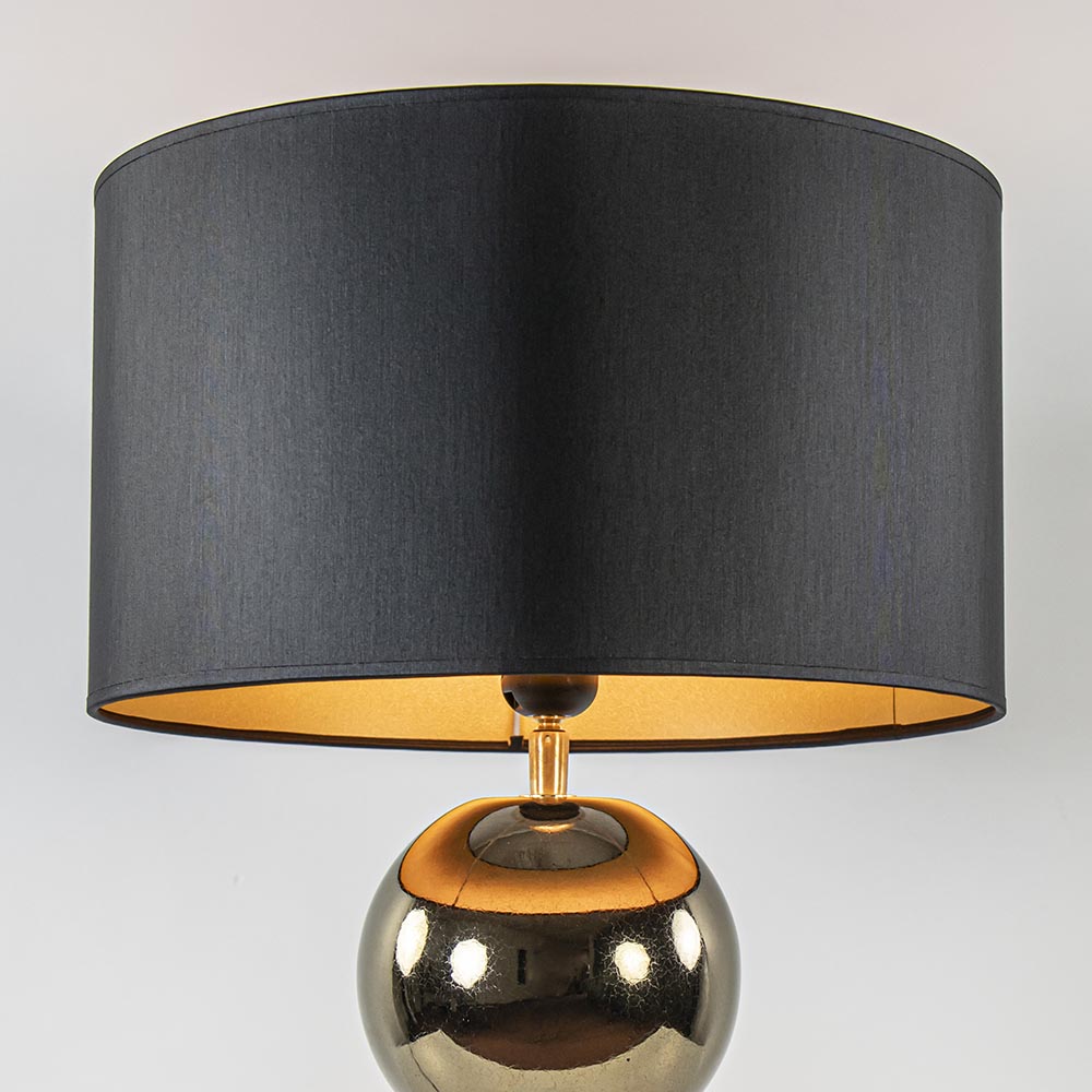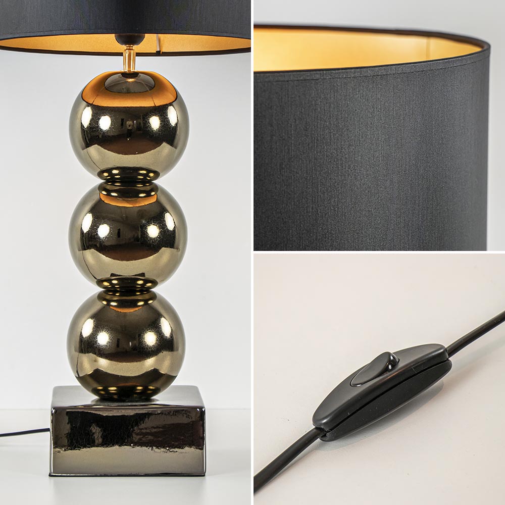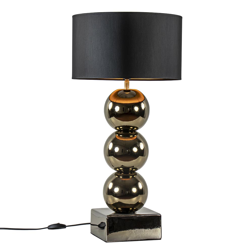 Een elegante toevoeging voor een strak klassiek of hotel chic interieur. De lampvoet is volledig gemaakt van keramiek en is uitgevoerd in het goud. Dit geeft de tafellamp een luxe uitstraling die compleet wordt gemaakt door de ronde kap in het zwart/goud. Deze wordt ondersteund door een fitting met kogelgewricht zodat u de kap gemakkelijk recht kunt zetten. De tafellamp met bollen is voorzien van een zwart snoer met een lengte van 140 cm. De schakelaar bevindt zich op 20 cm van de voet. De chique tafellamp met kap wordt exclusief lichtbron geleverd.