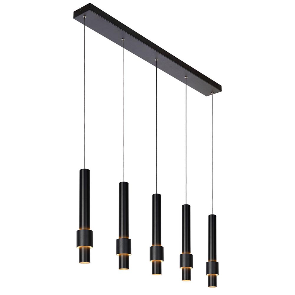 Modern met een design uitstraling. Deze unieke hanglamp zorgt niet alleen voor goed licht, maar ook voor een fijne sfeer. De 5-lichts hanglamp is gemaakt van aluminium en voorzien van LED verlichting. Het LED zit verwerkt in de cilinders en zorgt zo als down-lighter voor een fijne verlichting op uw tafel of bar. Daarnaast is er nog een tweede cilinder waar ook LED in is verwerkt. Deze zorgen voor indirect licht en geven met 2700 Kelvin een fijne sfeer. De hanglamp is uitgevoerd in het mat zwart, wat de lamp prima geschikt maakt voor diverse woonstijlen. De cilinder kappen hangen aan smalle snoeren die naar wens zijn in korten. Zo kunt u de kappen op één lijn hangen, of een speels effect creëren door ze te laten verspringen.