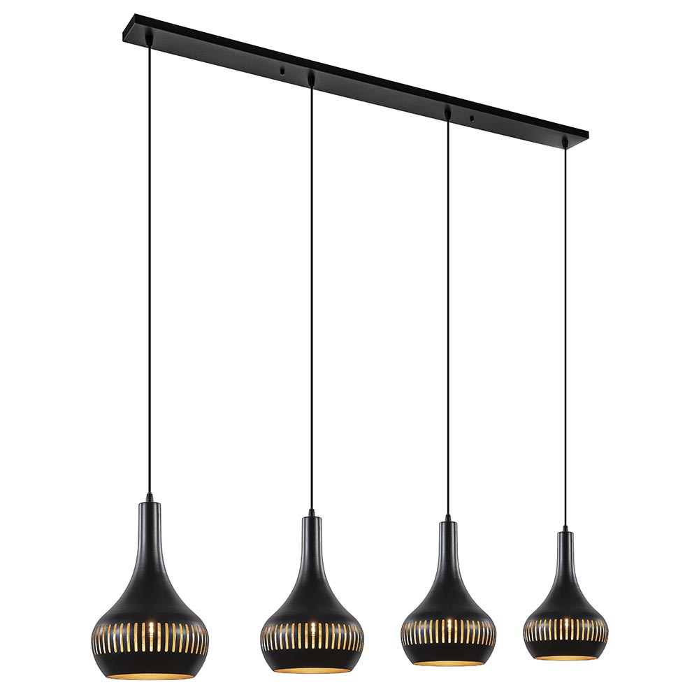 – hoogte: 175 cm – kappen: Ø25×38 cm – bevestiging: 140x10x2,5 cm – metaal – mat zwart/goud – exclusief lichtbron (4x E27) – dimbaar (exclusief)