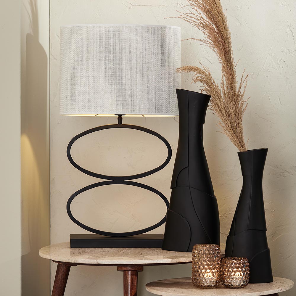 Deze stijlvolle tafellamp is in de vorm van een 8. Het mat zwarte metaal geeft de tafellamp een moderne look en hierdoor is de tafellamp te combineren in diverse woonstijlen. De tafellamp past perfect op een dressoir, kast of bijzettafel. De voet is te combineren met verschillende kleuren kap. De tafellamp heeft een snoer van 130 CM met de schakelaar op 35 CM van het armatuur. De lamp wordt exclusief kap geleverd.