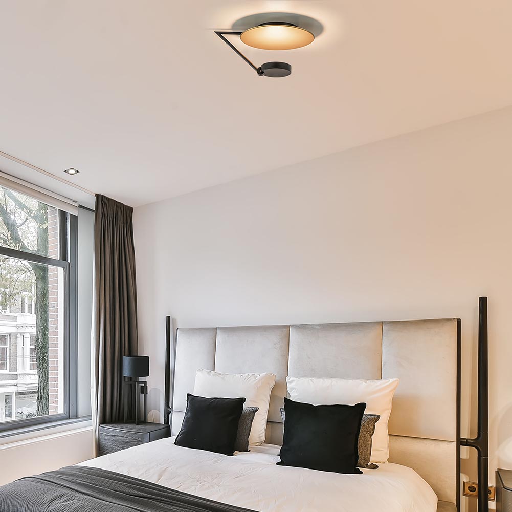 Deze design plafondlamp is een sfeermaker in de ruimte. De plafondlamp is voorzien van geïntegreerd LED en geeft indirecte verlichting. Hierdoor ontstaat er een sfeervol effect. Het licht wordt weerkaatst op de gouden plaat waardoor het ook een warme uitstraling krijgt. Door z’n formaat is de lamp prima geschikt voor een hal of kleine kamer. De LED plafondlamp zwart met goud is dimbaar middels de juiste dimmer (exclusief).