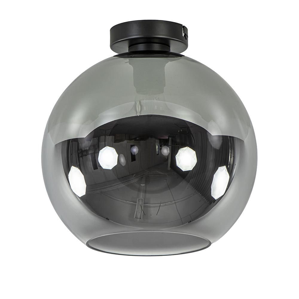 Een beetje extra luxe in de hal of slaapkamer? Dat kan met deze prachtige plafondlamp. De lamp bestaat uit een mat zwarte ronde bevestiging van 11 cm doorsnede en een smoke glazen bol van 30 cm doorsnede. Het glas heeft een titanium coating wat die extra luxe uitstraling geeft. Enerzijds geeft het een spiegelend effect en anderzijds wordt het glas donker transparant wanneer de lamp is ingeschakeld. De ronde plafondlamp is dimbaar middels een externe dimmer (exclusief) en wordt geleverd exclusief lichtbron.