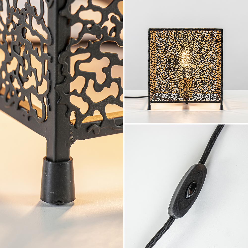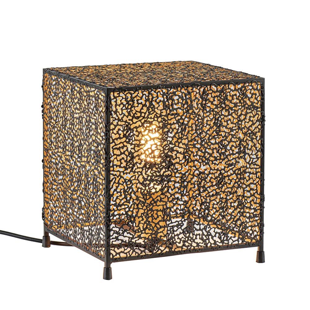 Stoer met een chique uitstraling. Deze moderne tafellamp doet een beetje denken aan koraal en is gemaakt uit kleine metaaldeeltjes die samen een vierkante kap vormen. Het metaal is afgewerkt met een mat zwarte finish aan de buitenzijde en een gouden finish aan de binnenzijde. Het goud zorgt voor een chique uitstraling en creëert een sfeervolle warme gloed. De tafellamp wordt geleverd inclusief zwart snoer van 200 CM. De schakelaar bevindt zich op 50 CM van het armatuur. Het tafellampje staat op vier sierlijke pootjes.