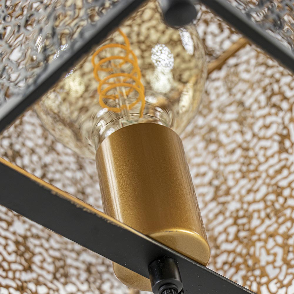 Details: – Afmetingen: 22 x 22 x 24 CM – Pootjes: Ø 0.5 x 2 CM – Snoer: 200 CM – Metaal, mat zwart / goud – Exclusief lichtbron (E27) – Dimbaar (exclusief)