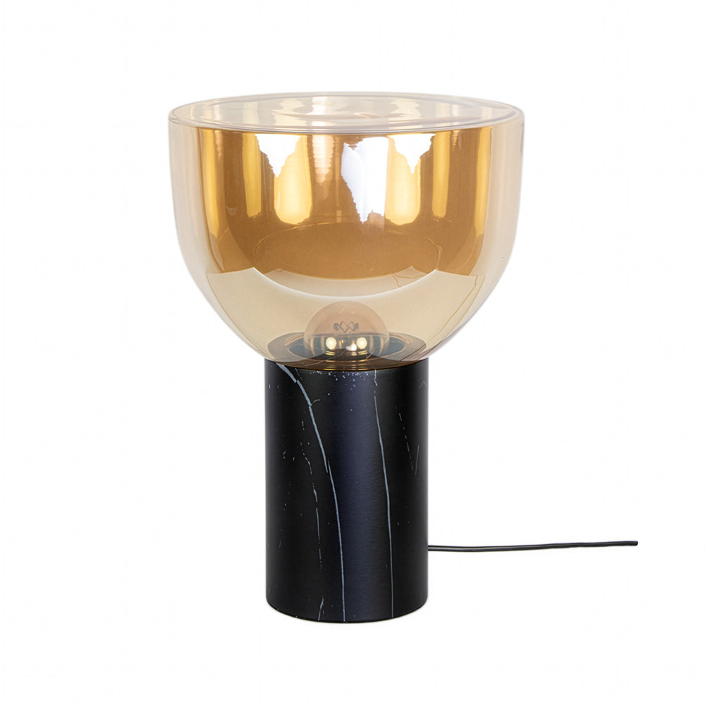 De Lana tafellamp is verkrijgbaar in twee formaten die afzonderlijk te bestellen zijn, maar ook prachtig met elkaar combineren. Het ontwerp valt direct op door de luxe amberkleurige glazen kap in combinatie met de zwarte cilindervormige voet met subtiele marmerstructuur. Deze materialen zorgen samen voor een warme, chique uitstraling die perfect past in zowel moderne als sfeervolle interieurs.