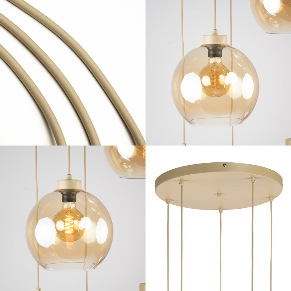 Highlights • Vijf grote amberkleurige glazen bollen (Ø 25 cm) inbegrepen • Lichtbronnen niet inbegrepen – geschikt voor decoratieve én standaard E27 lampen • Ronde plafondplaat in zachte beige tint • Extra lange snoeren van 4 meter voor speels hoogteverschil • Perfect voor hoge ruimtes zoals een vide, trapgat of boven een grote eettafel