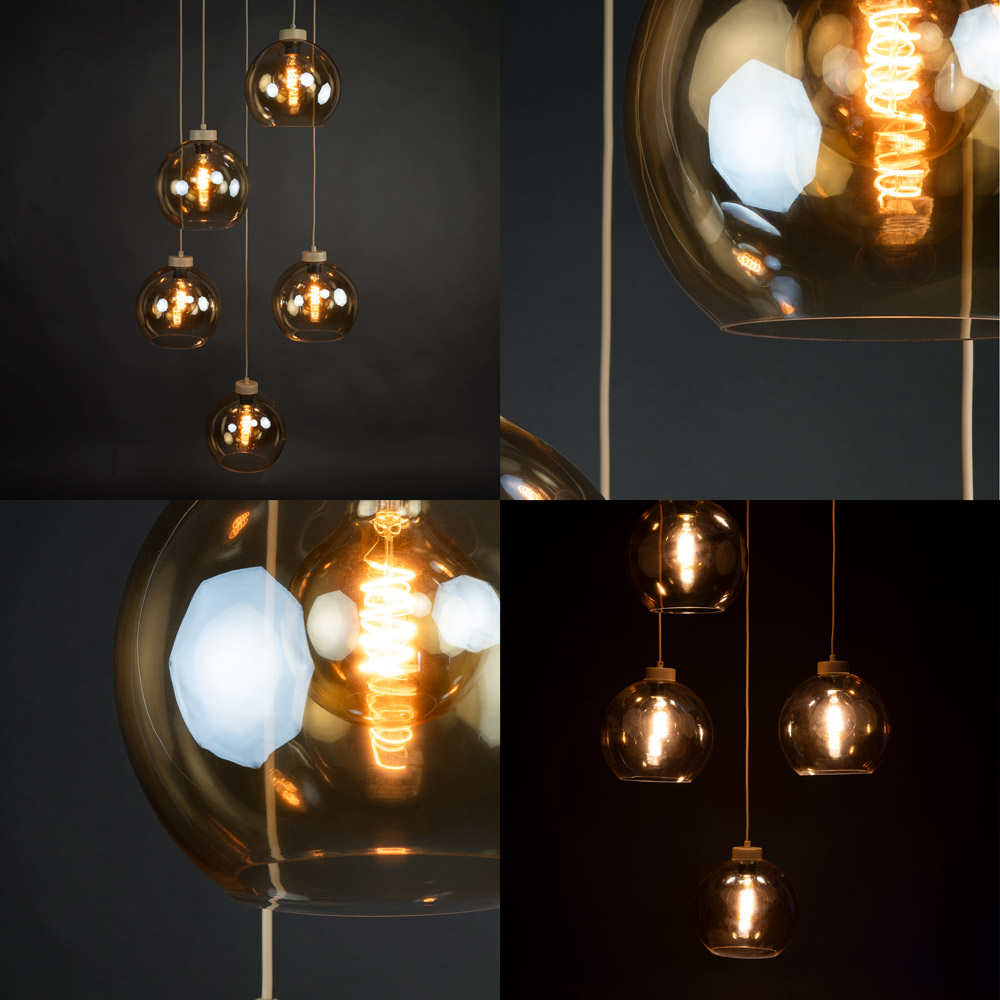 Waarom kiezen voor deze hanglamp? • Amberkleurige glazen bollen standaard inbegrepen • Vrijheid om zelf de lichtbron te kiezen • Speels en ruimtelijk effect door lange snoeren • Ideaal als statement lamp in hoge ruimtes