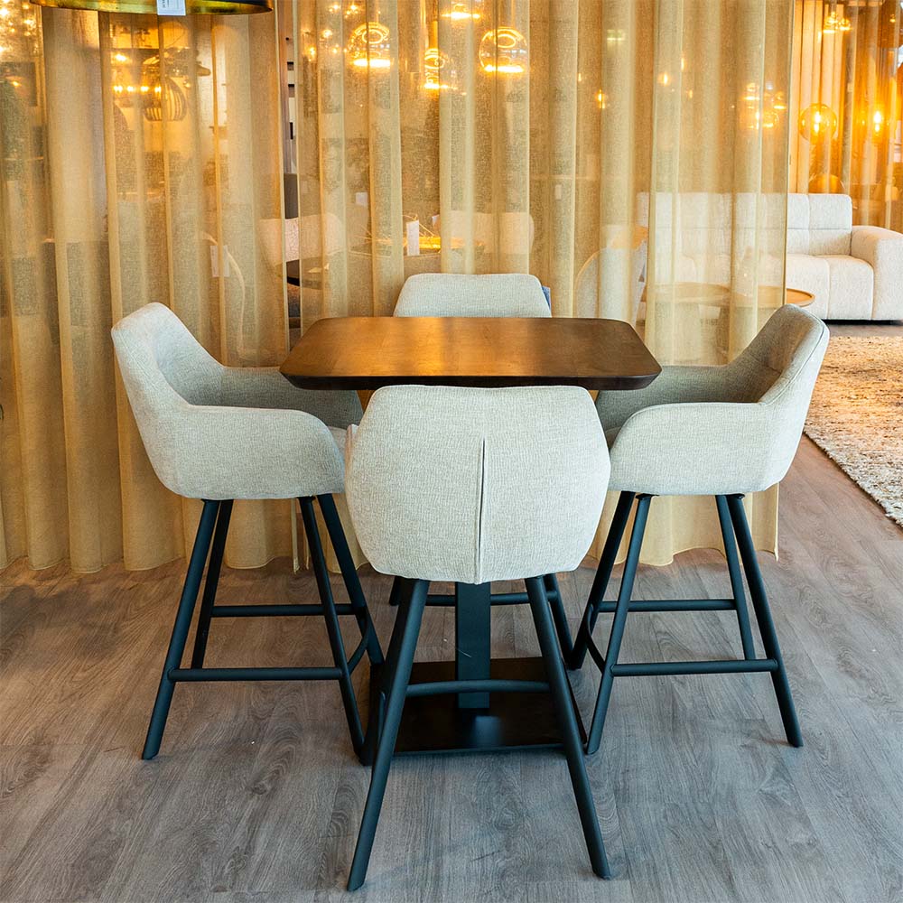 Het stevige zwarte metalen onderstel is bij alle varianten identiek. Dankzij de solide vierkante voet staat de bartafel uitzonderlijk stabiel, ideaal voor dagelijks intensief gebruik.