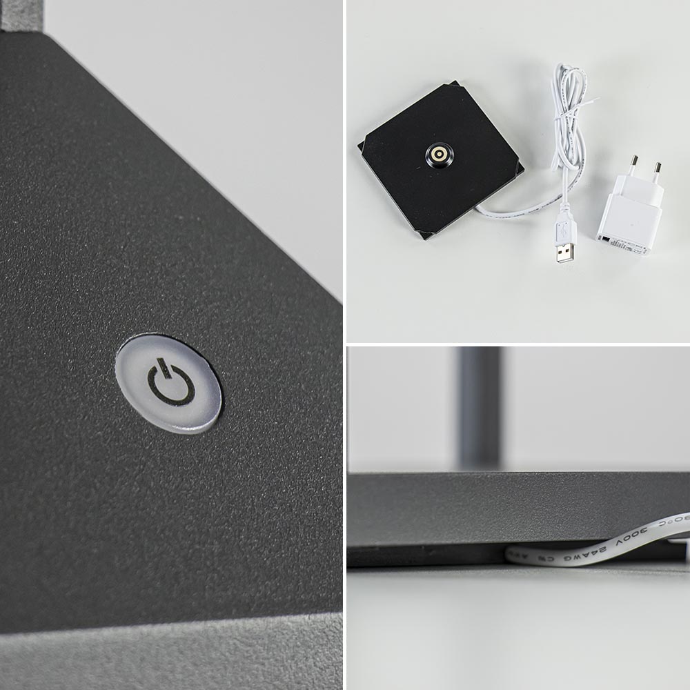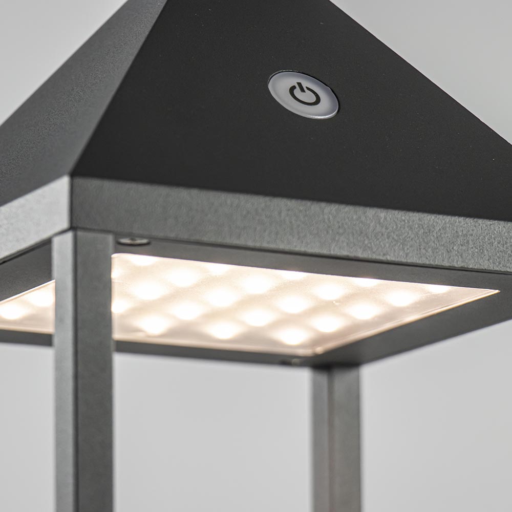 – afm: 14x14x47 cm – aluminium – antraciet – inclusief LED – 2.2 W – 3000 Kelvin – 155 lumen – dimbaar – touchdimmer – draadloos – inclusief oplaadkabel (micro USB) – IP54 goedgekeurd