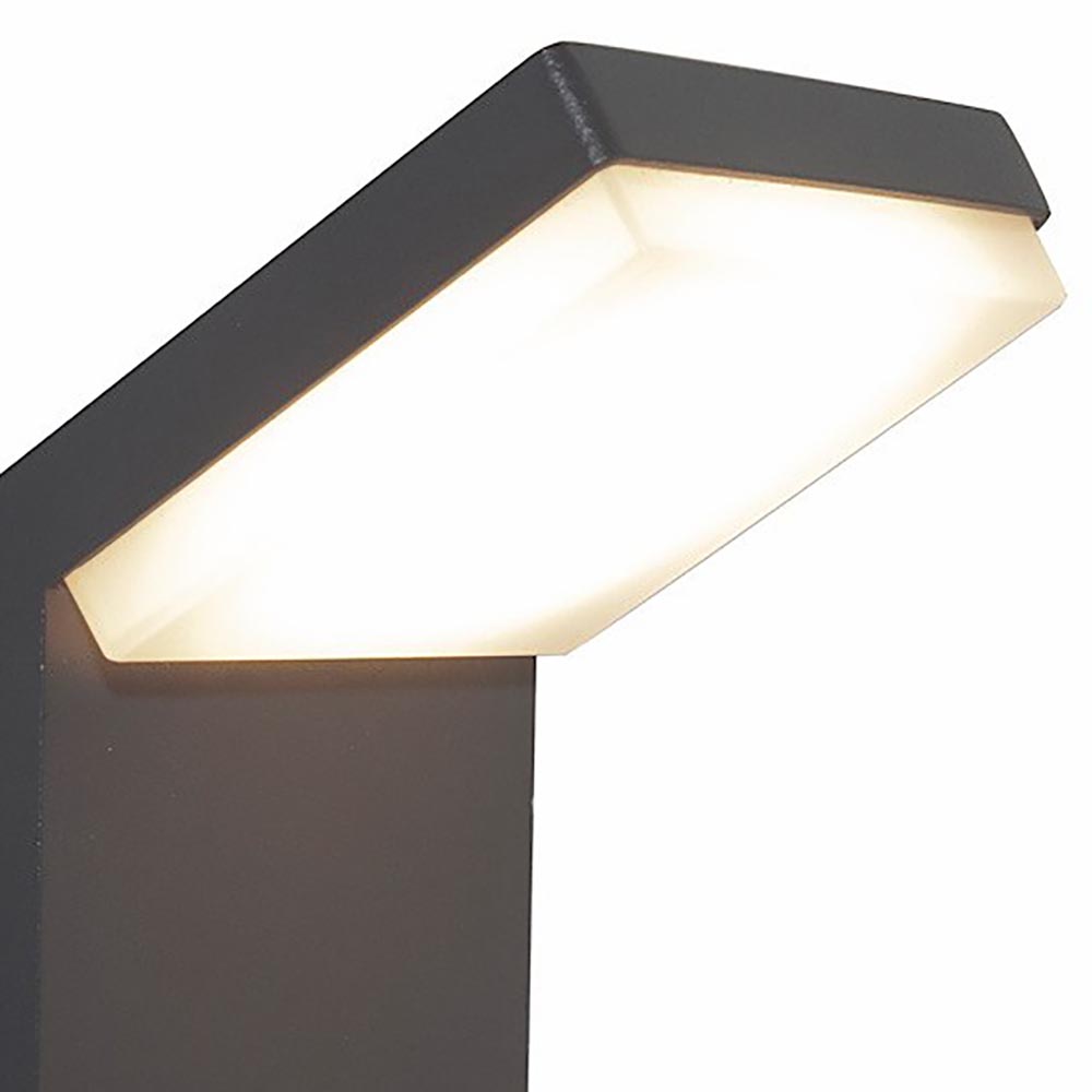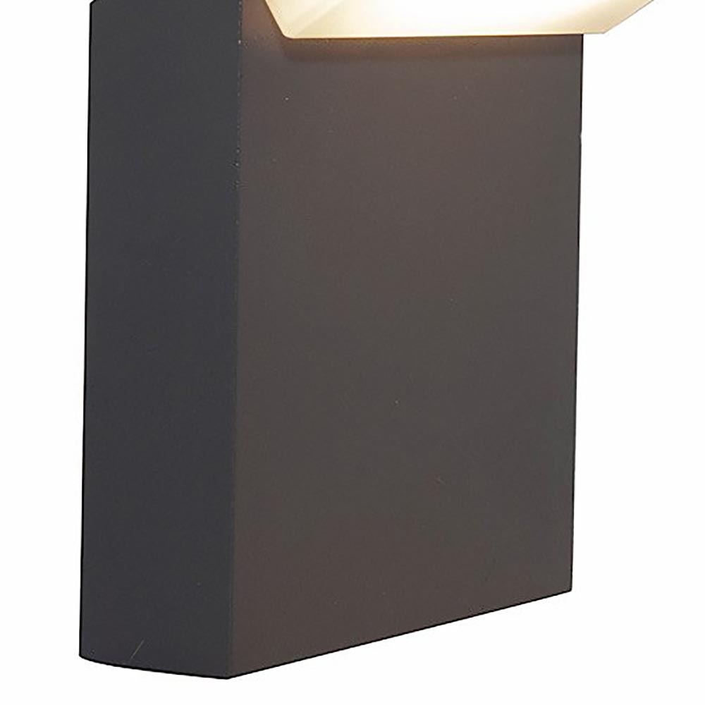 Een moderne wandlamp met een strak design. De rechthoekige buitenlamp is gemaakt van aluminium en uitgevoerd in het antraciet. Het aluminium is gecombineerd met een kunststof kap die is voorzien van geïntegreerd LED. Dit is energiezuinig en wordt niet warm. Doordat de kap in een hoek is geplaatst geeft deze een mooie lichtverspreiding naar beneden. Het LED geeft met 3000 Kelvin een sfeervolle warm witte verlichting die mooi past naast de deur. De moderne buitenlamp is IP65 goedgekeurd en kan daardoor gemakkelijk op diverse plekken worden toegepast.