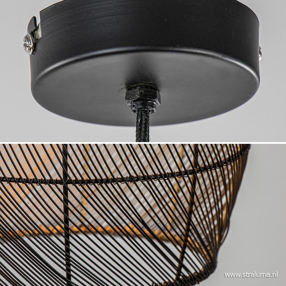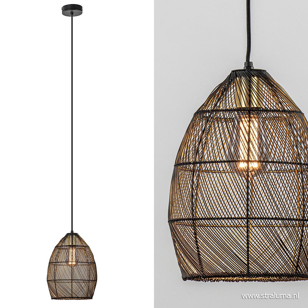 – hoogte: 150 cm (verstelbaar) – kap: Ø23×31 cm – bevestiging: Ø10×3 cm – draadkap, mat zwart/goud – zwart stofomwonden snoer – exclusief lichtbron (E27) – dimbaar (exclusief)