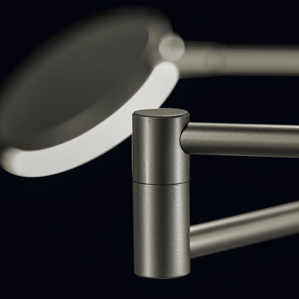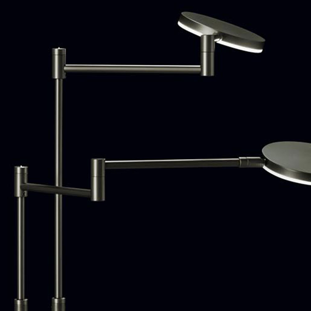 – kop 2x Ø 12 cm, hoogte 1,5 cm – hoogte verstelbaar van 95 cm tot 140 cm – armen van beide poten: 22 cm en 20 cm lang – voet Ø 24 cm, hoogte 3 cm – antraciet finish – geïntegreerd led, dus energiezuinig – beide lampen voorzien van touchdimmer