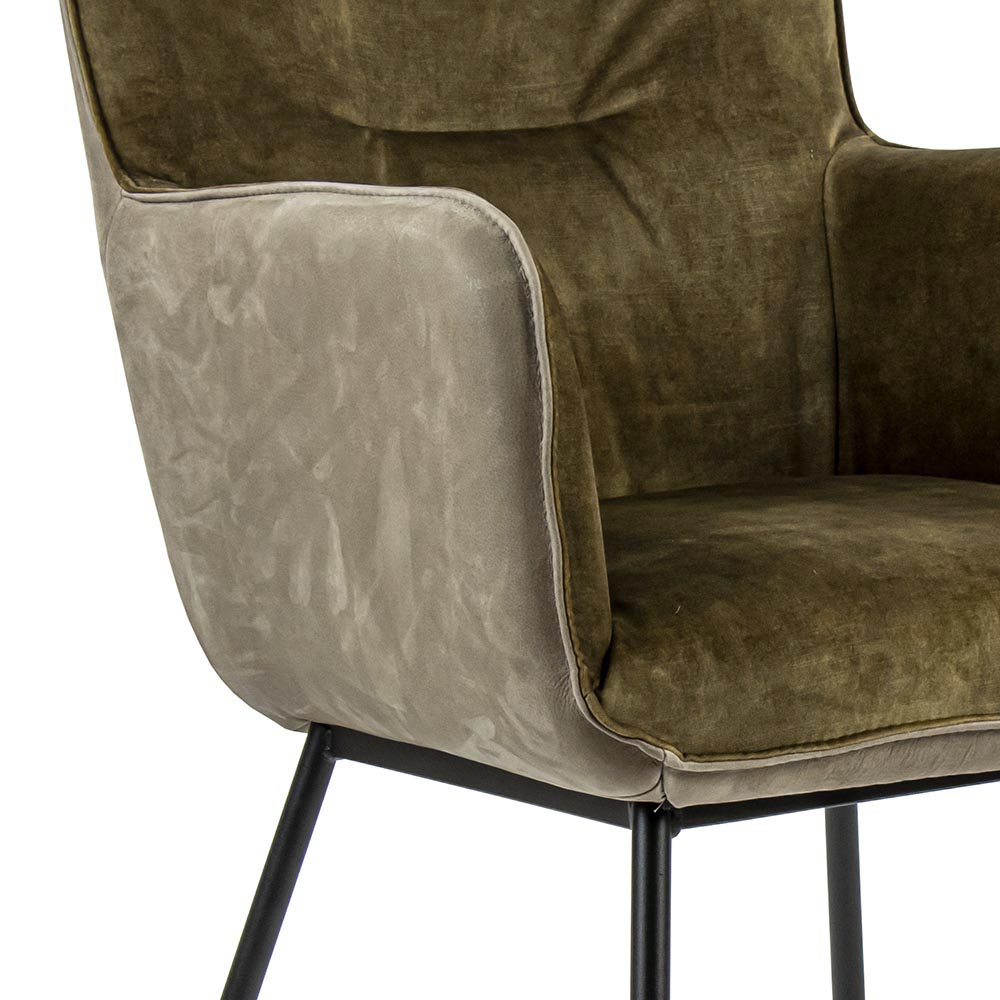 Deze prachtige eetkamerstoel is een verrijking voor het interieur. De armstoel is uitgevoerd in het leder met stof wat de stoel een luxe uitstraling geeft. Het leder is uitgevoerd in het taupe en de stoffen zitting in het velours in een groen/bruine tint. De stoel heeft een hoog zitcomfort dat wordt versterkt door de armleuningen. De slanke metalen pootjes zijn afgewerkt met een mat zwarte finish en geven de stoel een moderne touch.