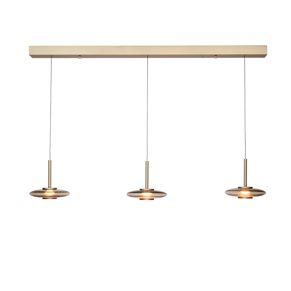 Specificaties: • Producttype: Hanglamp • Aantal lichtpunten: 3 • Afmetingen lamp: Max. H 190 × L 152 × B 31 cm • Plafondbevestiging: H 5 × L 130 × B 9 cm • Materiaal: Metaal en glas • Lichtbron: Geïntegreerde LED (niet vervangbaar) • Lichtkleur: Warm wit (2700K) • Lichtopbrengst: 950 lumen • Dimbaar: Ja, via externe schakelaar of dimmer • Hoogteverstelling: Easy lift systeem