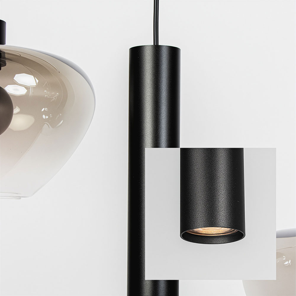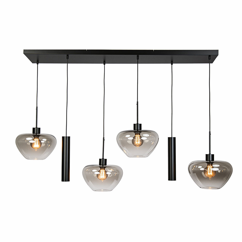 De Cipolla in mat zwart is een moderne eyecatcher voor boven je eettafel of kookeiland. Deze 6-lichts hanglamp combineert een strak metalen armatuur met elegante glazen kappen in een rookachtige tint. Het contrast tussen de ronde glasvormen en de minimalistische cilinders creëert een speels en evenwichtig lijnenspel dat perfect aansluit bij een eigentijds interieur.