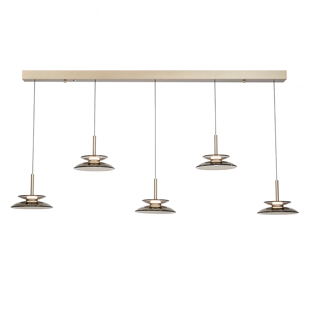 Deze moderne 5-lichts hanglamp is een echte eyecatcher boven je eettafel of kookeiland. De combinatie van het warme bronskleurige frame met de luxe amber-glazen schijven geeft de lamp een elegante en verfijnde uitstraling. Het lijnenspel van de vijf hangers zorgt voor een mooi ritme en een evenwichtige look in de ruimte.