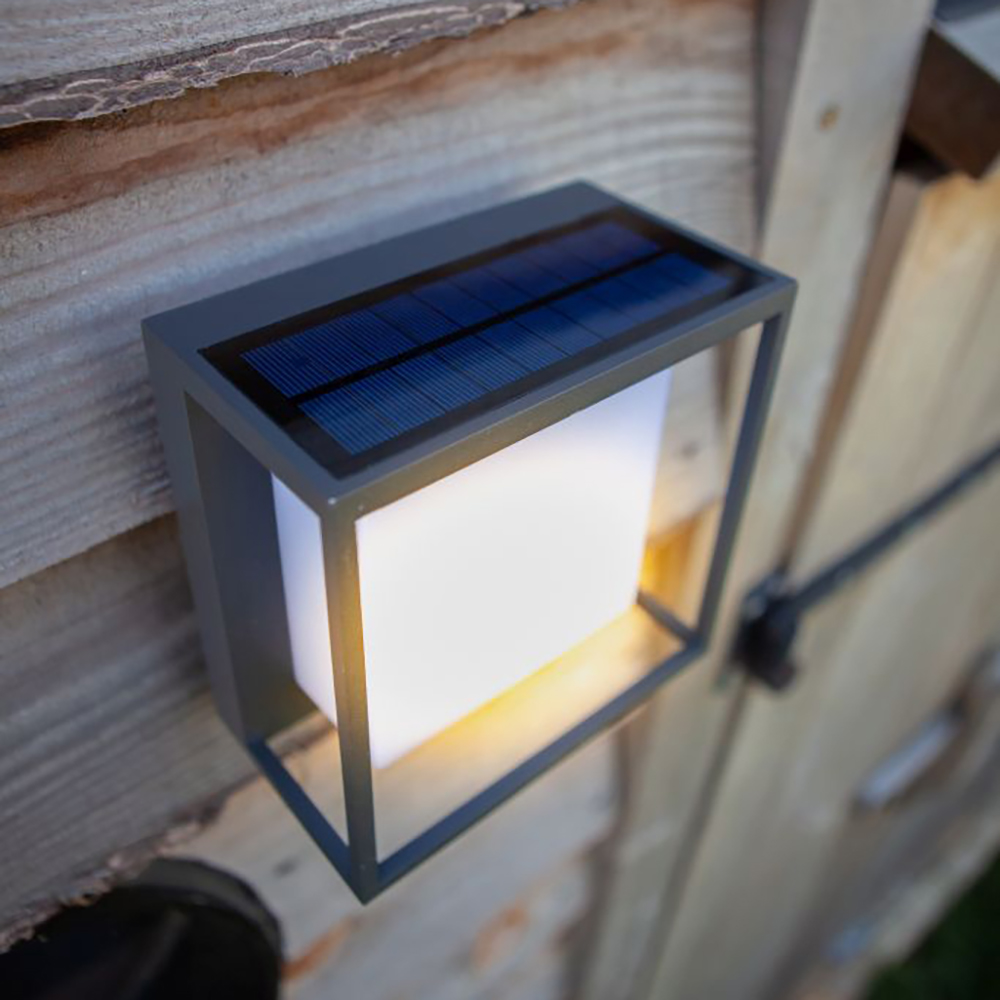 Een moderne solar buitenlamp met een strakke vormgeving. De solar buitenlamp heeft een aluminium armatuur dat is uitgevoerd in het donker grijs. Dit is gecombineerd met een witte kunststof kap waarin de LED verlichting zich bevindt. Bovenop het armatuur is het zonnepaneel te vinden waarmee de lamp wordt opgeladen. De solar buitenlamp is voorzien van een bewegingssensor.