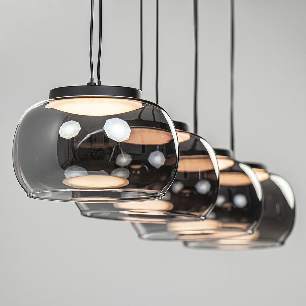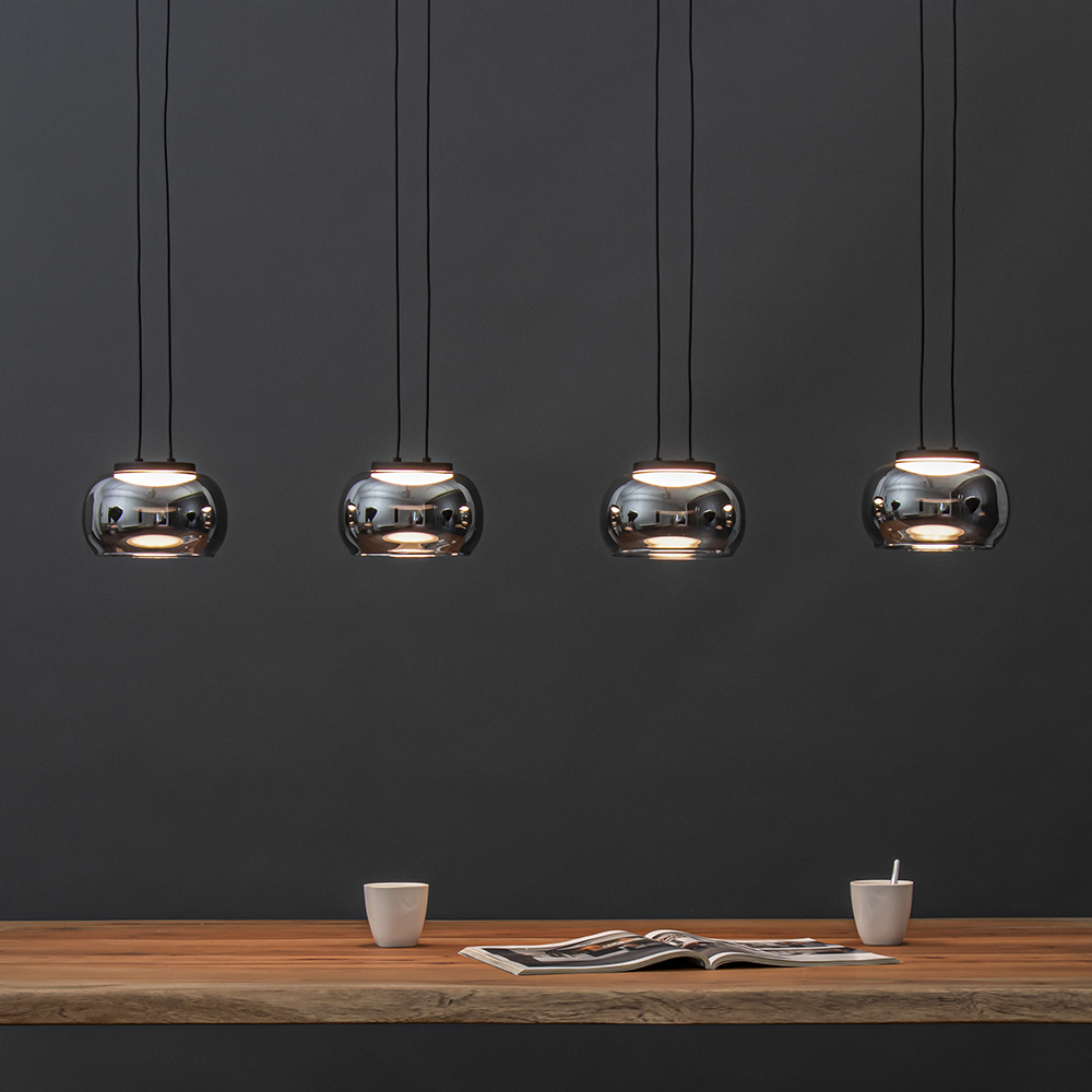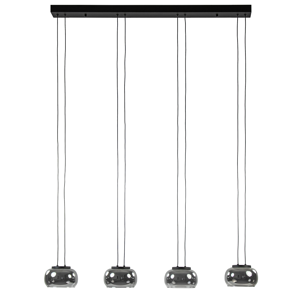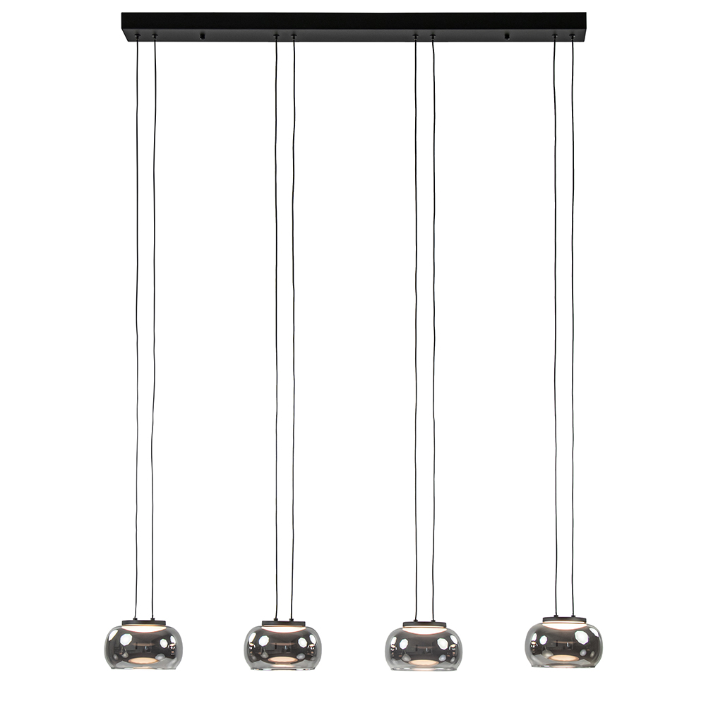 Chic en elegant van uitstraling deze 4-lichts LED hanglamp. De eettafelhanglamp heeft een metalen balk waar de kappen evenredig over zijn verdeeld. Iedere kap hangt aan twee snoeren en is naar wens in te korten. Een snoer dient voor de stroom en de ander voor extra support. De smoke glazen kappen geven de hanglamp een stoere en luxe uitstraling die mooi matcht in de huidige woonstijlen. De 4-lichts LED hanglamp is dimbaar middels een externe dimmer (exclusief).
