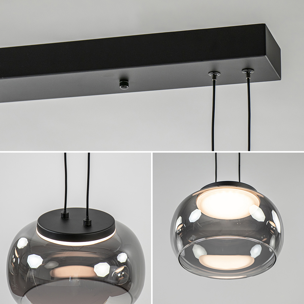 – afm: 118x18x150 cm – bevestiging: 106x8x4 cm – kappen: Ø18×11 cm – metaal, mat zwart – smoke glas – inclusief LED – 2700 Kelvin – 1500 lumen – dimbaar (exclusief) – in hoogte verstelbaar