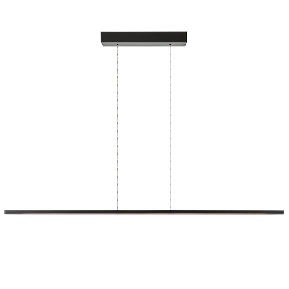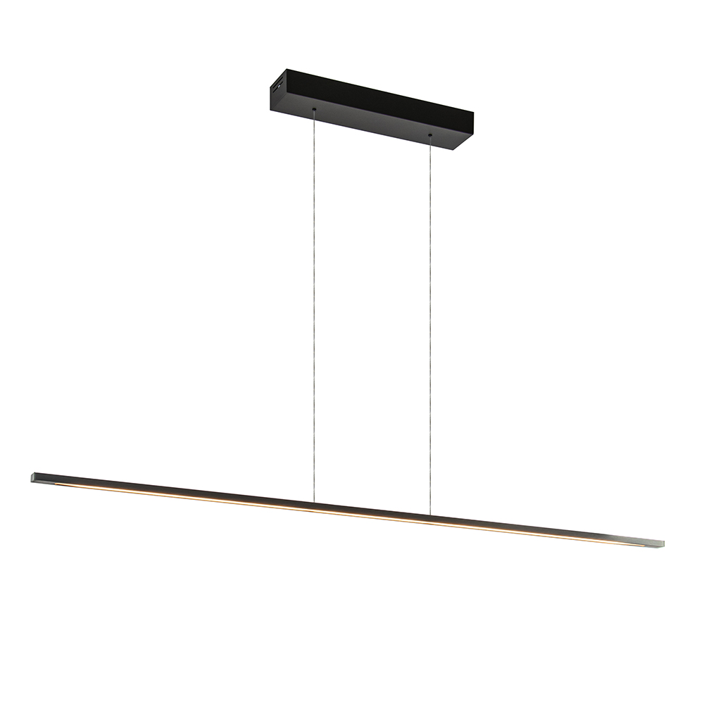 Deze prachtige LED hanglamp is een verrijking voor het interieur. De moderne hanglamp heeft een minimalistisch en strak design dat is voorzien van de meest innoverende technologie. Zo kunt u de lamp gemakkelijk in hoogte verstellen dmv het catrol systeem. Door de balk omlaag te trekken bepaald u gemakkelijk en snel de juiste hoogte. Het systeem in de bevestiging zorgt dat de kap blijft hangen op de hoogte waar u loslaat. Toch liever iets hoger, geen probleem, u duwt de kap gemakkelijk weer wat omhoog waardoor de snoeren weer wat intrekken. Verder is de langwerpige kap van 130 cm ook dimbaar met een sensor. Met handgebaren kunt u de verlichting snel bedienen door de intensiteit en keur te veranderen. Geen gedoe met externe dimmers of schakelaars. De moderne hanglamp is uitgevoerd in het zwart nikkel en heeft een magnetische plafondbevestiging.