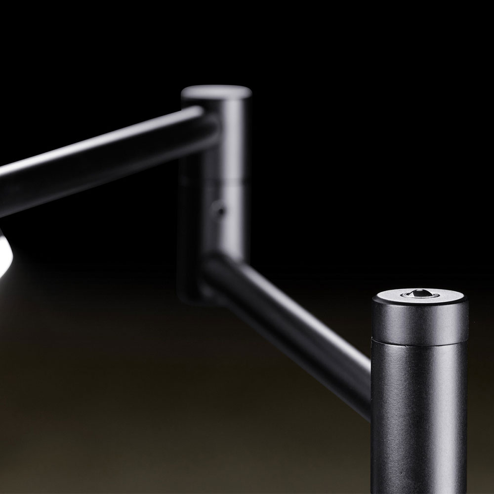 – kop Ø 12 cm, hoogte 1,5 cm – hoogte verstelbaar van 95 cm tot 140 cm – armen 22 cm en 20 cm lang – voet Ø 21 cm, hoogte 2 cm – zwarte finish – geïntegreerd led, dus energiezuinig – voorzien van touchdimmer