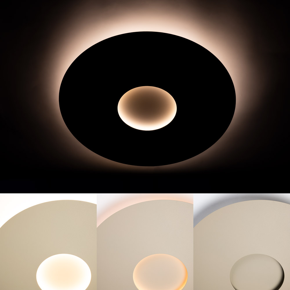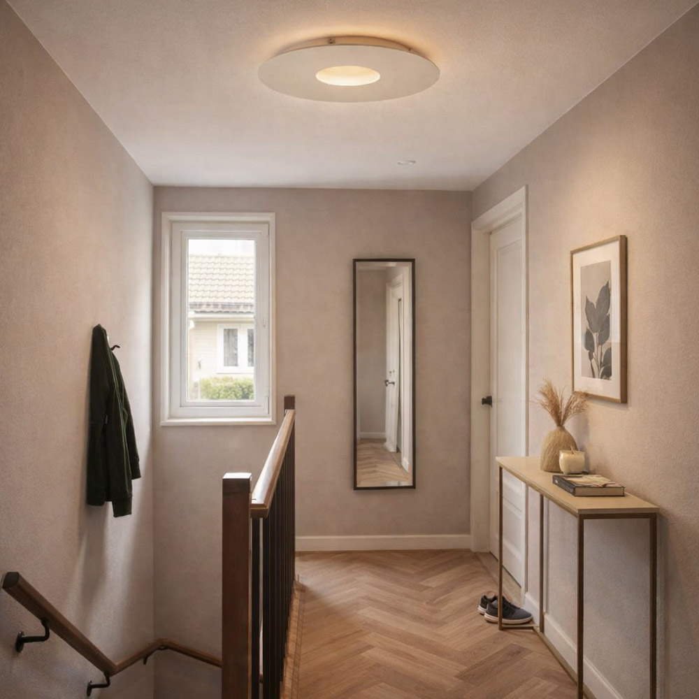 • Strakke, moderne plafonnière van slechts 4 cm hoog • Licht vanuit zowel de binnen- als buitenring • Geïntegreerde LED-verlichting • Dimbaar via externe wanddimmer • Perfect voor hal, slaapkamer of lage plafonds