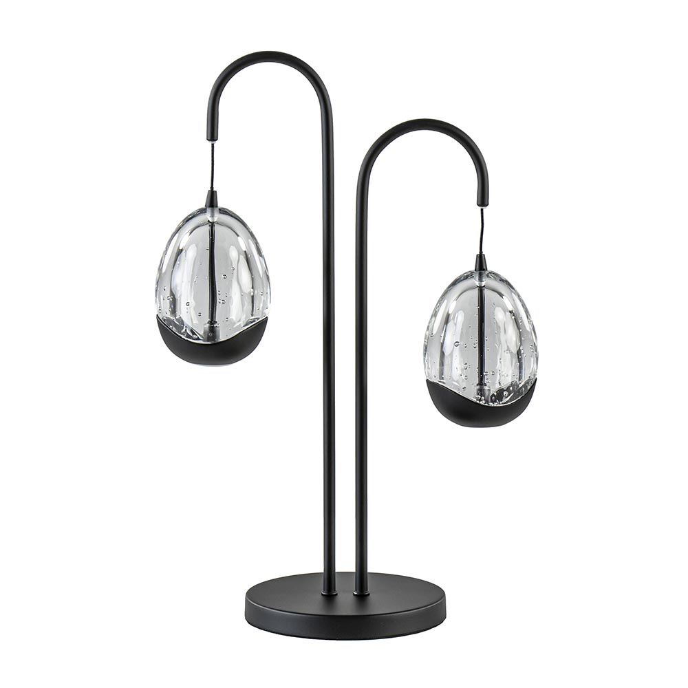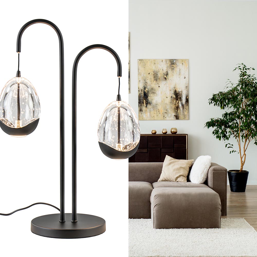 Een sfeervolle toevoeging voor op een dressoir, bijzettafel of zelfs het nachtkastje. De 2 kapjes zijn gevormd als een ei en voorzien van LED verlichting. De kapjes zijn deels van massief glas en deels matzwart metaal. Ook het frame is mat zwart. Dit geeft de lamp een stoere uitstraling. Het glas is voorzien van luchtbelletjes wat de tafellamp een speels effect geeft. De verlichting geeft direct licht naar beneden door middel van de spot onderop het ei, en daarnaast ook indirect licht doordat het ei van binnenuit verlicht wordt. Dit tafellampje is gemakkelijk te dimmen met de bijgeleverde dimmer. De dimmer van de lamp bevindt zicht op 40 CM van het armatuur.