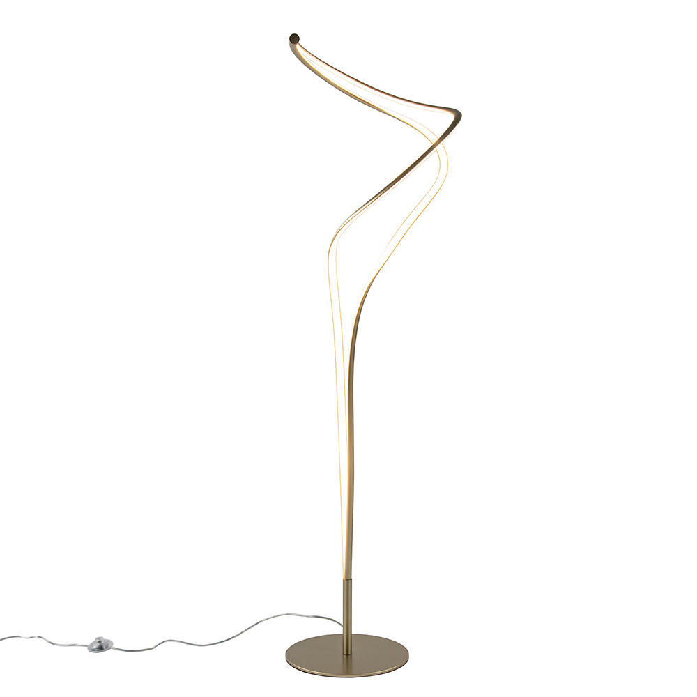 Strak van design en organisch van vorm. Deze moderne vloerlamp past helemaal in de huidige woontrends. De vloerlamp heeft een goud armatuur en is over de sierlijke armen volledig voorzien van geïntegreerd LED. Deze geeft met 5500 lumen een fijne lichtopbrengst. Is deze te veel? Dan dimt u de lamp gemakkelijk dmv de dimmer in het snoer ingedrukt te houden. Ook kunt u de kleurtemperatuur veranderen door een druk op de dimmer. Deze varieert van 2300 en 3000, tot 4000 Kelvin. In iedere kleurtemperatuur kunt u de lamp dimmen. Creëer dus gemakkelijk en snel de sfeer die past bij het moment. De moderne LED vloerlamp is voorzien van een transparant snoer met een lengte van 210 cm. De dimmer zit op 65 cm van voet.