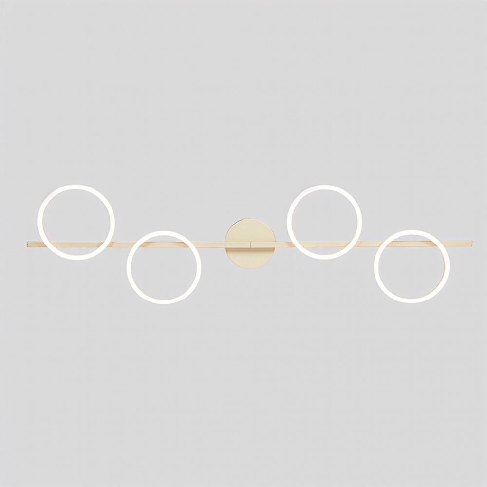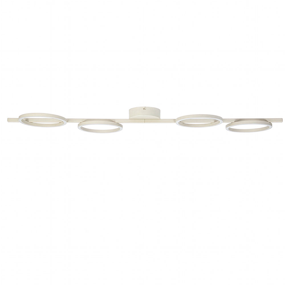 Deze moderne plafonnière met 4 cirkelvormige lichtpunten is een echte eyecatcher voor in de woonkamer, eetkamer of hal. Het minimalistische ontwerp in een elegante zandkleur oogt warm en eigentijds, terwijl de open ringen zorgen voor een speels en luchtig effect. De horizontale lijn met perfect verdeelde cirkels brengt balans en karakter in elk interieur.