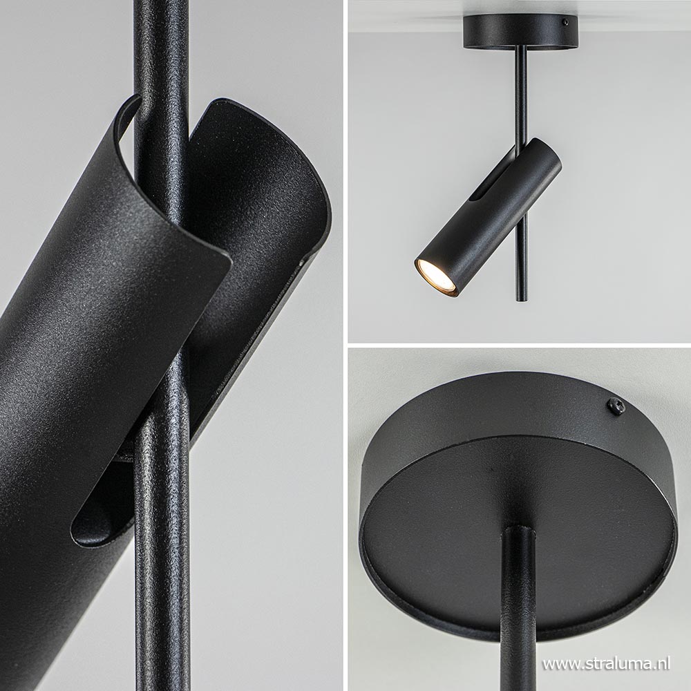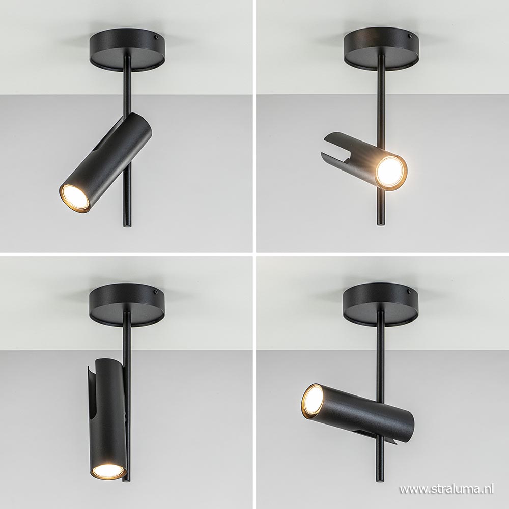 Een moderne plafondspot met een uniek design. De plafondlamp is volledig van metaal en uitgevoerd in mat zwart. Het unieke design maakt dat de spot in verschillende manieren is te verstellen. Zo is de kap te kantelen en te draaien waarbij de opbouwspot op iedere manier een andere vorm/look krijgt. Ideaal wanneer u iets wilt uitlichten of de lamp als extra sfeerlicht wilt plaatsen. De moderne plafondlamp leent zich prima voor een ruimte als een hal of toilet, maar ook in de woon- of slaapkamer kan de plafondspot prima worden toegepast. De zwarte spot wordt geleverd zonder lichtbron (GU10).