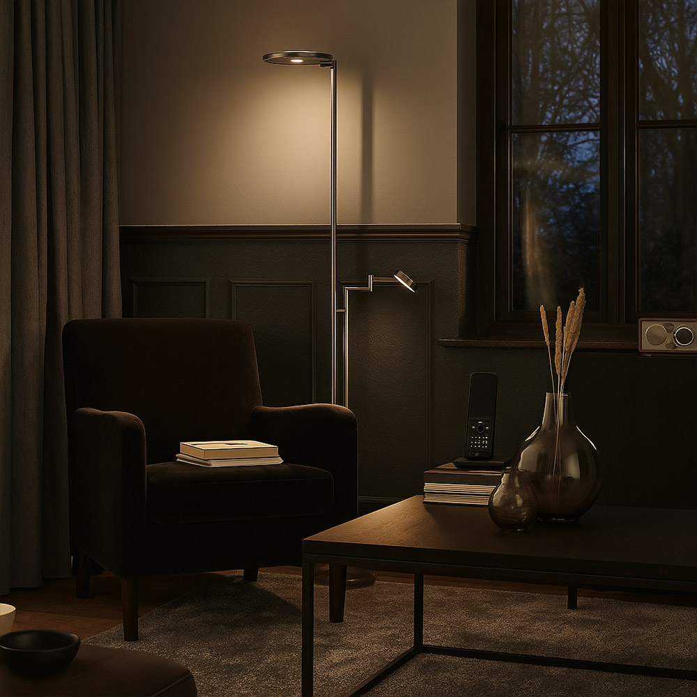 De uplight is zowel naar boven als naar beneden te draaien, zodat je de verlichting perfect kunt afstemmen op de ruimte. De leeslamp is in hoogte verstelbaar en voorzien van een handige touch button, terwijl de uplight via een discrete knop op de stang te bedienen is. Beide lampen zijn apart regelbaar, waardoor je altijd de juiste balans vindt tussen sfeer- en functioneel licht.