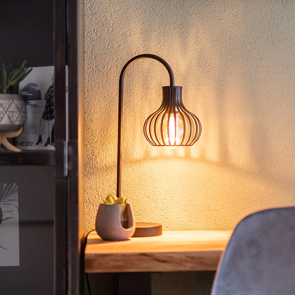 Draadlampen zien we veelal als hanglamp maar zoals dèze lamp hebben we ze nog niet gezien. Dit leuke tafellampje is voorzien van een draadkap in de vorm van een ui die mooi doorlopt in de gebogen arm van het armatuur. Het ronde kapje heeft wat bredere speilen zodat deze een moderne look krijgt. Het armatuur is volledig van metaal en afgewerkt met een mat zwarte finish. Het matte zwart zorgt ervoor dat dit draad tafellampje is diverse woonstijlen is te combineren als modern, Scandinavisch of landelijk. Door het formaat past het zwarte draadlampje gemakkelijk op een kast, bijzettafel of zelfs op het nachtkastje. De tafellamp heeft een zwart snoer van 190 cm met een schakelaar op 40 cm van de voet. De mat zwarte draad tafellamp wordt geleverd zonder lichtbron (E27).