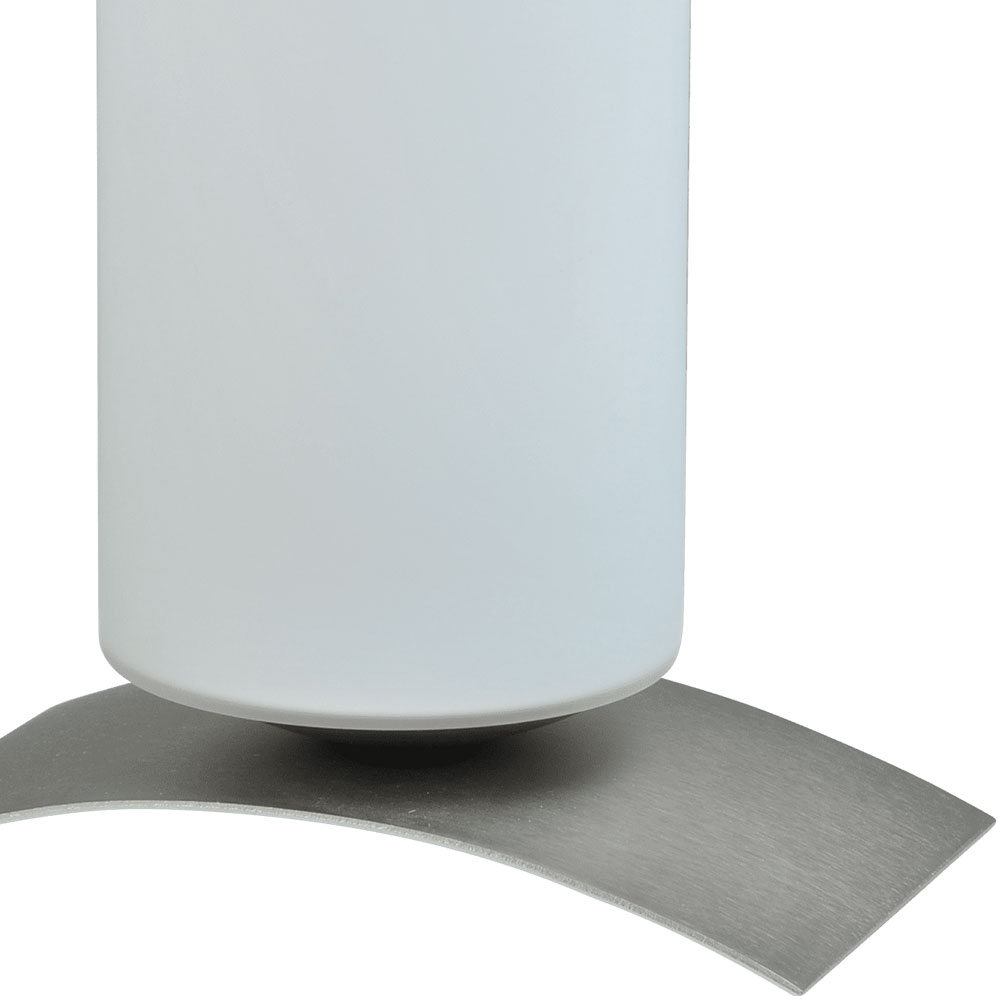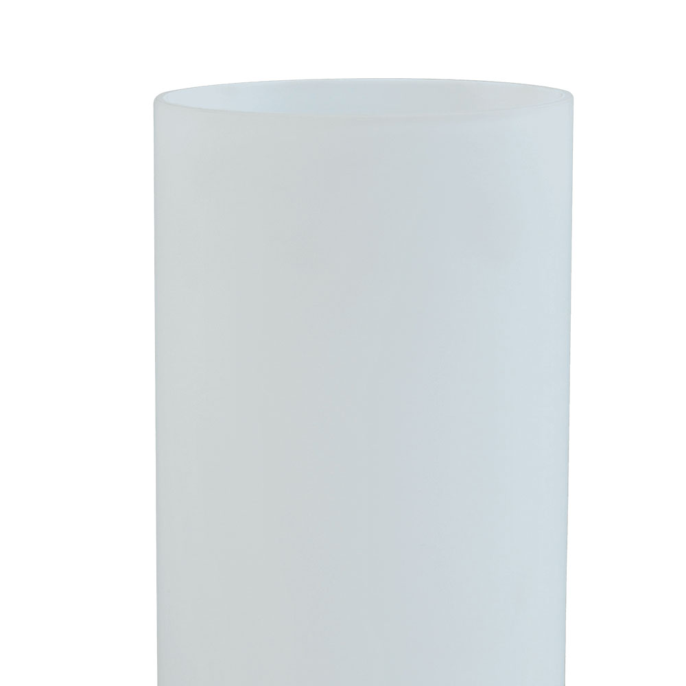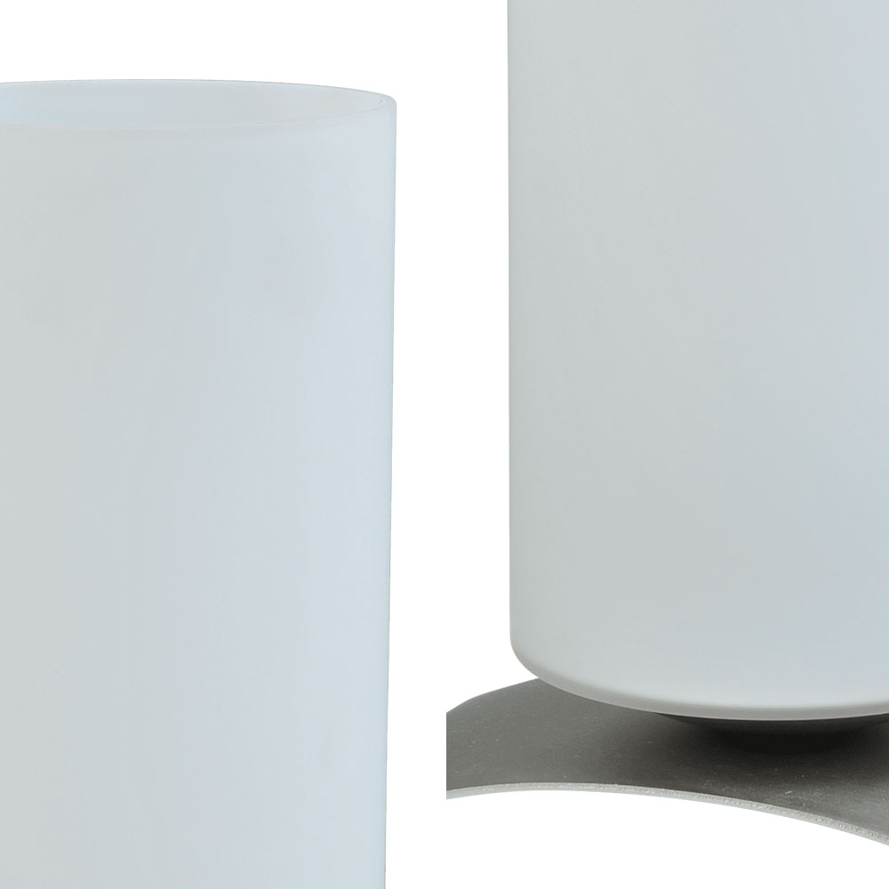 – hoogte 28 cm – breedte 17,5 cm – diepte 10 cm – maten glas: Ø 10 cm, hoogte 25 cm – voet: nikkel – glas: mat wit