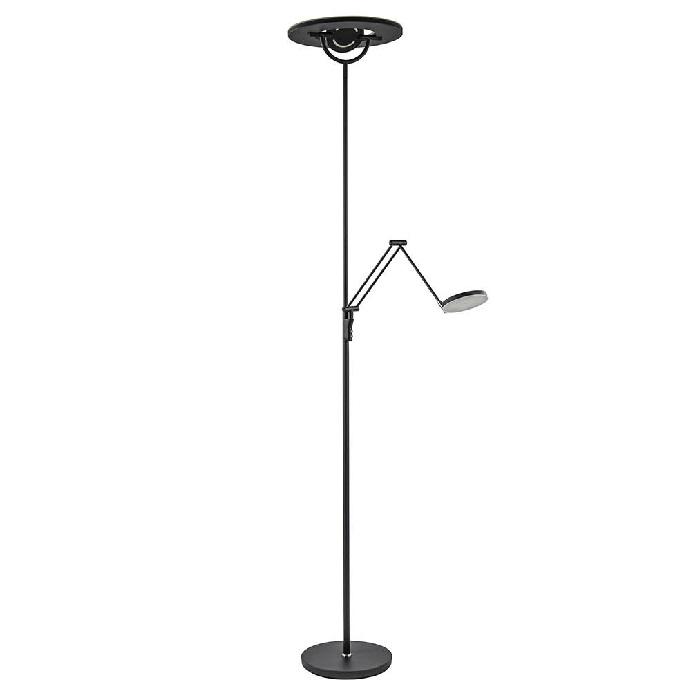 – hoogte: 183 cm – voet: Ø27×3 cm – uplighter 1: Ø32×1,5 cm – uplighter 2: Ø11×1,5 cm – leeslamp: Ø12×1,5 cm – metaal, mat zwart – inclusief LED – 4000 + 1000 lumen – 2200-3000 Kelvin – dimbaar – zwart snoer